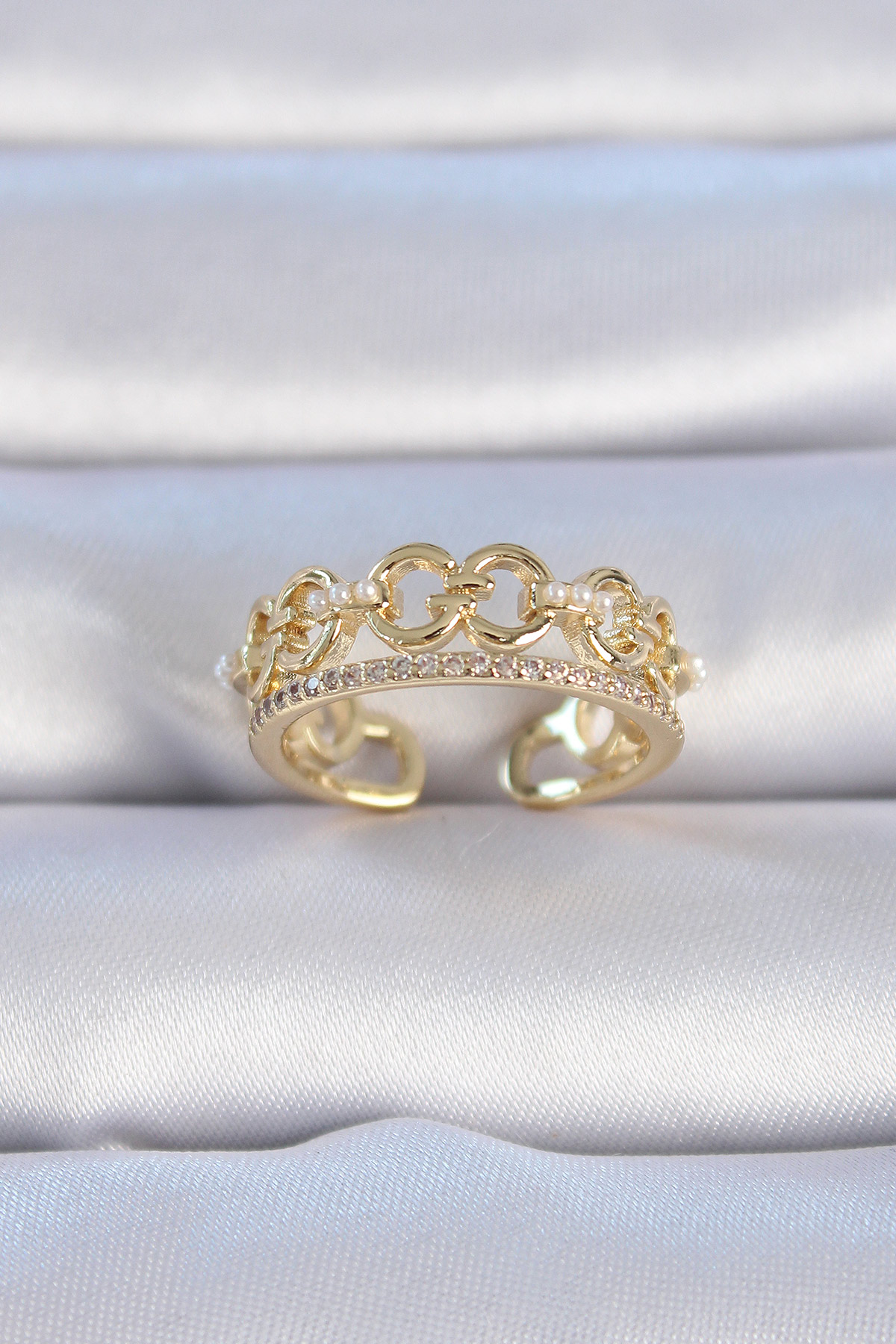 Pirinç Gold Renk Zirkon Taşlı İnci Detay Kadın Yüzük - TJ-BYK3334