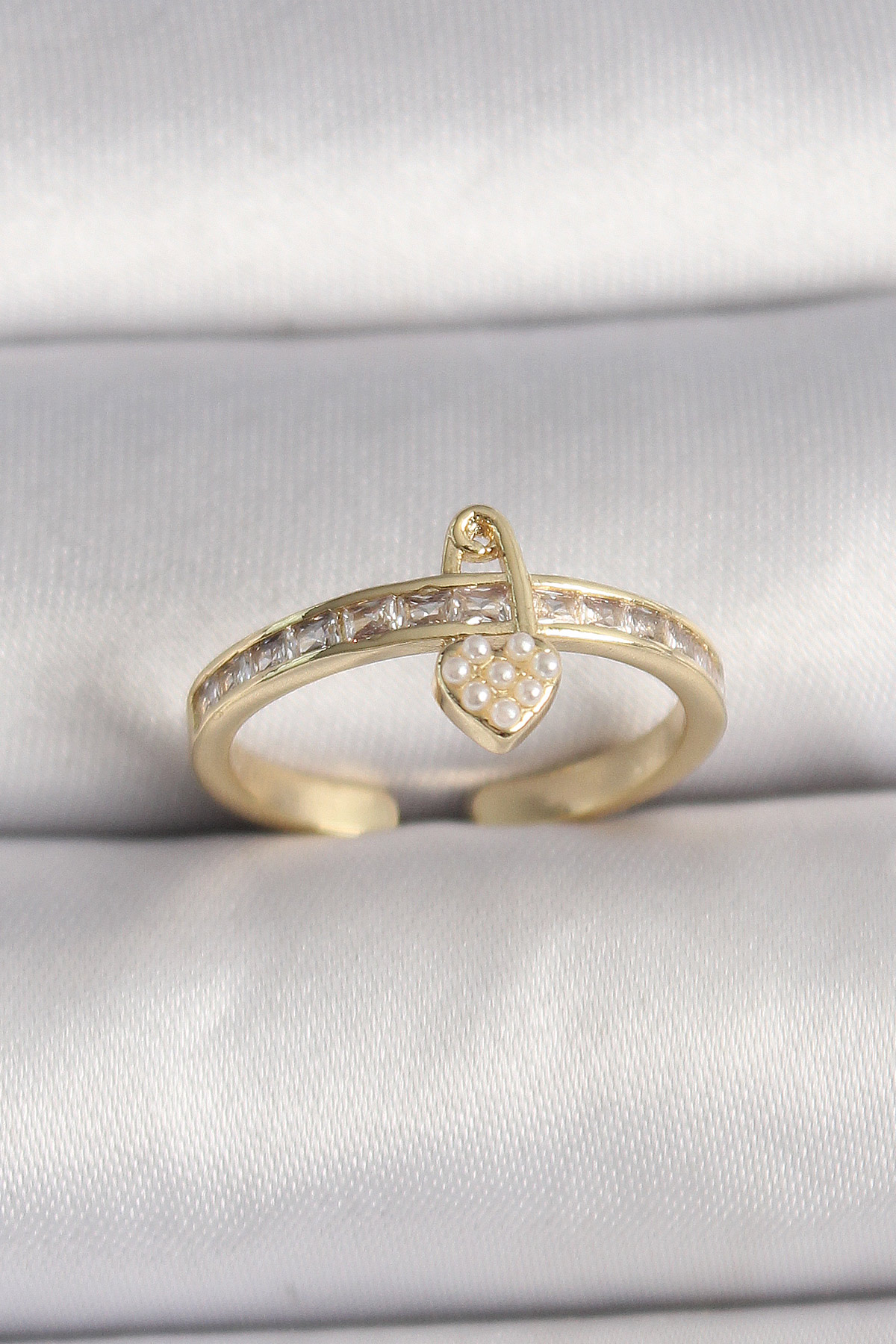 Pirinç Gold Renk Zirkon Taşlı İnci Detay Kilit Kalp Figür Ayarlanabilir Yüzük - TJ-BYK3537