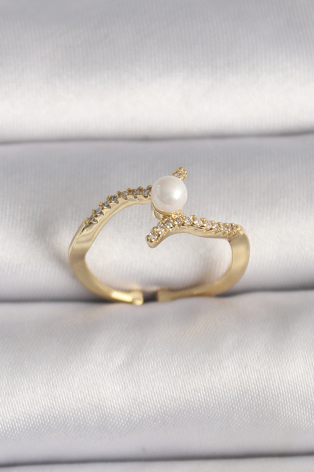 Pirinç Gold Renk Zirkon Taşlı İncili Ayarlanabilir Yüzük - TJ-BYK3547