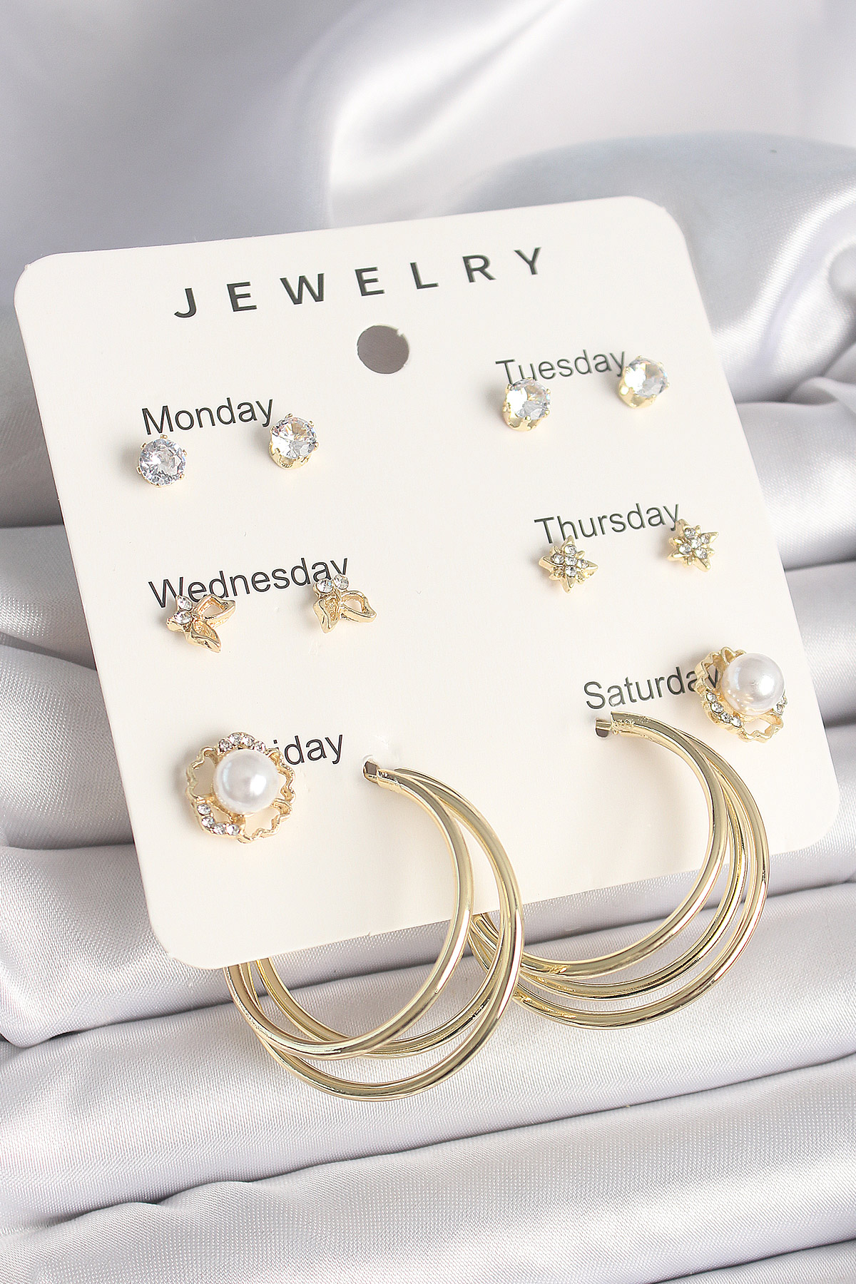 Pirinç Gold Renk Zirkon Taşlı İncili Halka Figür 7'Li Set Model Kadın Küpe Seti - TJ-BKP10319