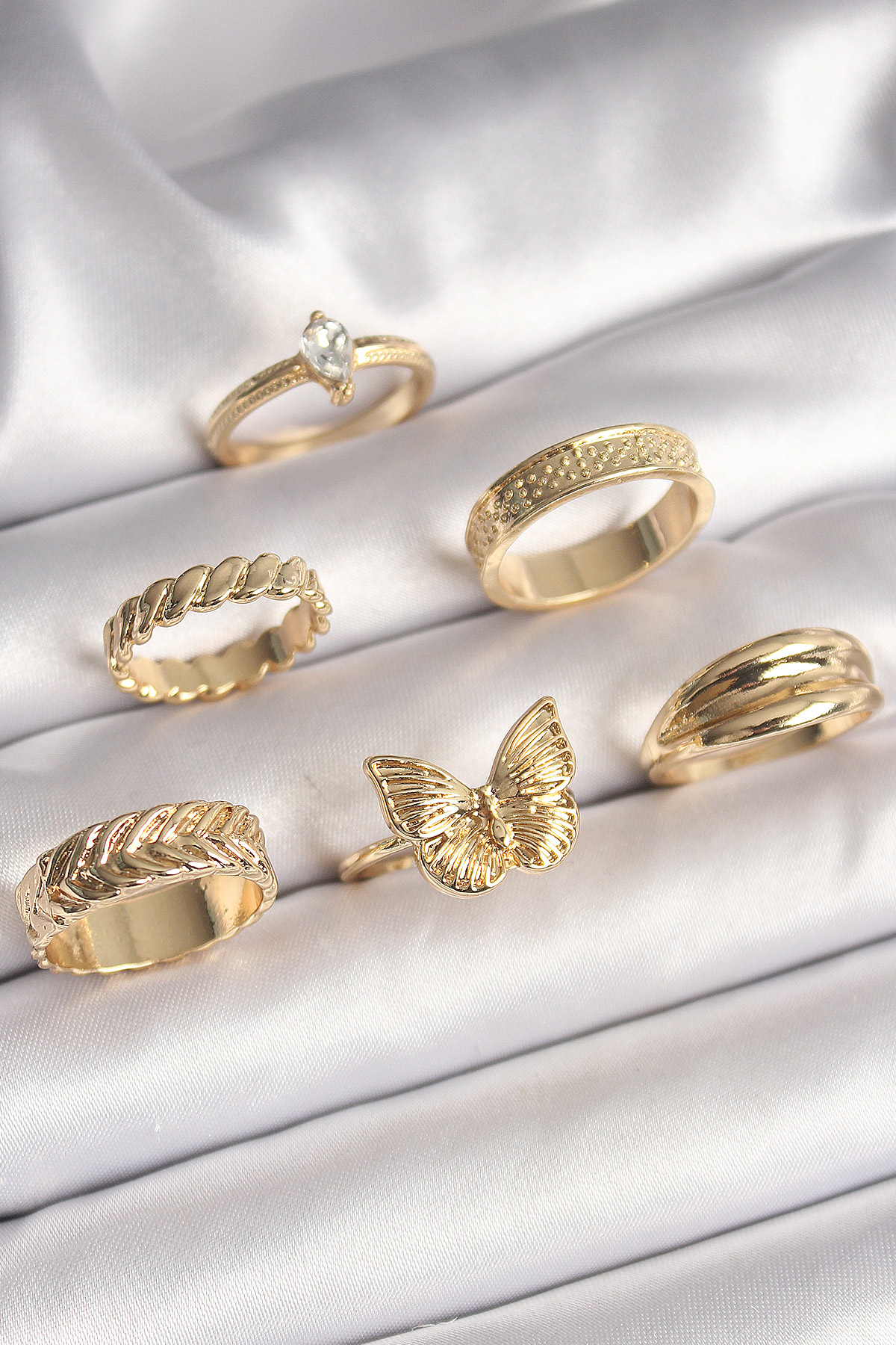 Pirinç Gold Renk Zirkon Taşlı İşleme Detaylı Kelebek Figürlü 6'Lı Kadın Yüzük Seti - TJ-BYK3627