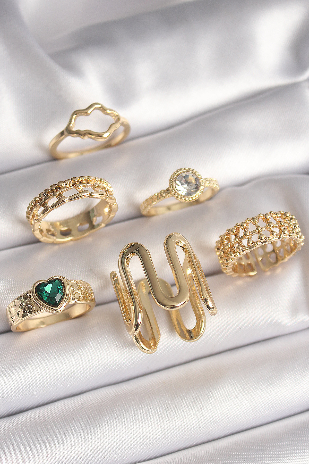 Pirinç Gold Renk Zirkon Taşlı İşleme Plaka Model Yeşil Kalp Detay 6'Lı Kadın Yüzük Seti - TJ-BYK3632