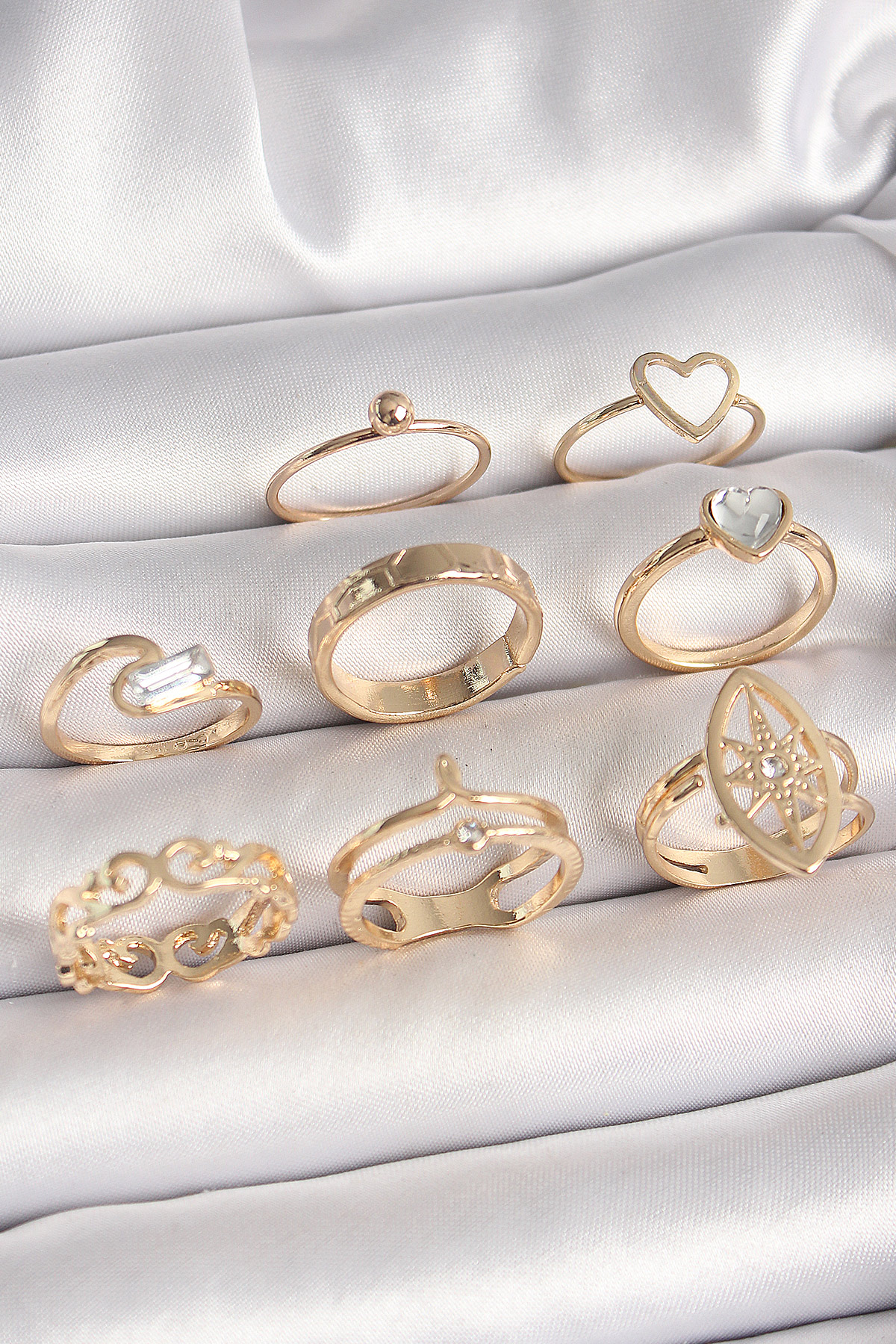 Pirinç Gold Renk Zirkon Taşlı Kalp Model Kutup Yıldız Detay Kadın Yüzük Kombini - TJ-BYK3667