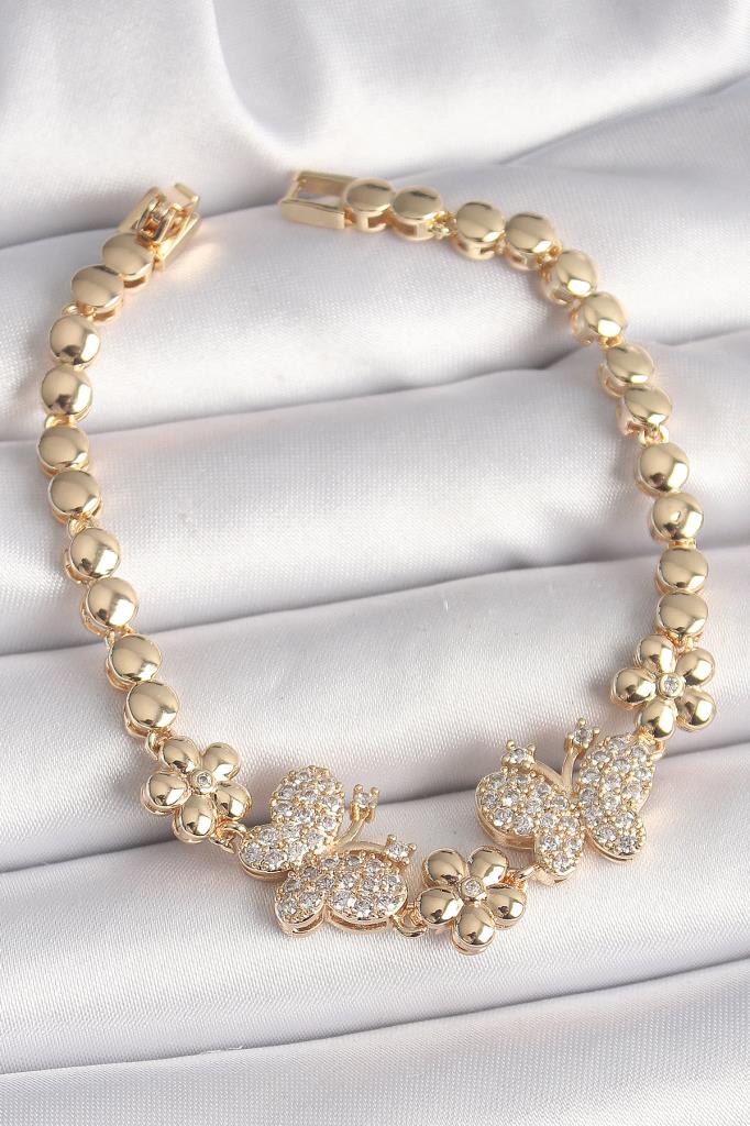 Pirinç Gold Renk Zirkon Taşlı Kelebek Figür Çiçek Zincir Model Kadın Bileklik - BB6826