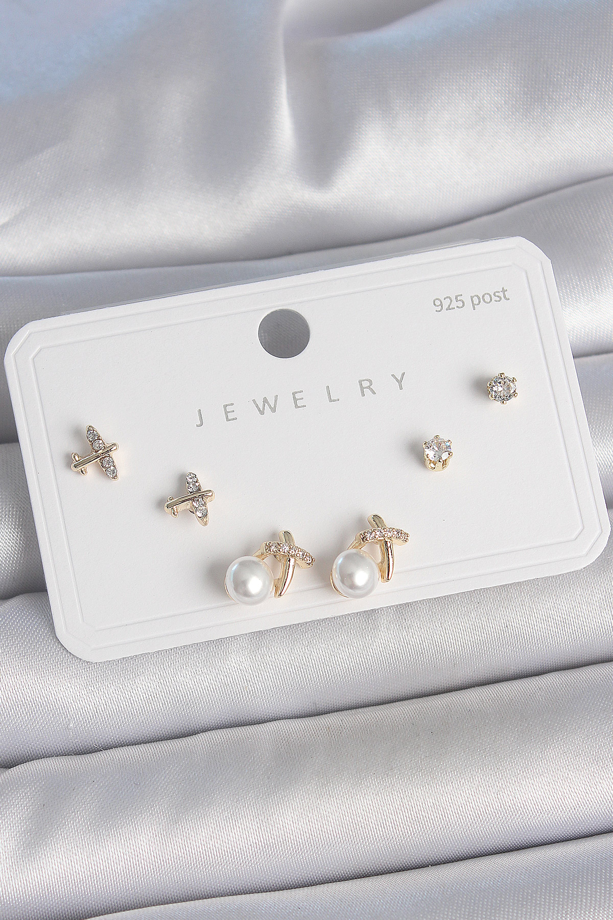 Pirinç Gold Renk Zirkon Taşlı Kelebek Model İnci Detay 925 Ayar Gümüş Çivi Kadın Küpe Seti - TJ-BKP10478