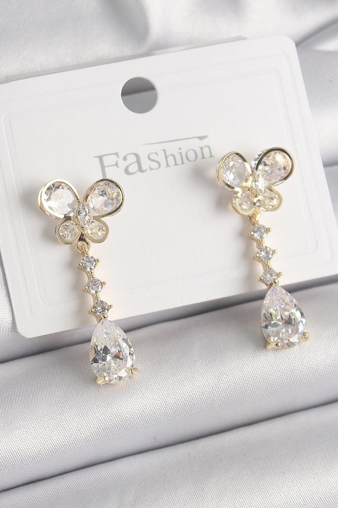 Pirinç Gold Renk Zirkon Taşlı Kelebek Model Sallantı Damla Zirkon Taş Kadın Küpe - TJ-BKP9860