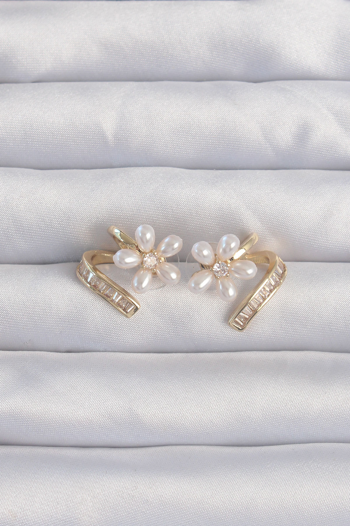 Pirinç Gold Renk Zirkon Taşlı Kıvrımlı İnci Çiçek Küpe - TJ-BKP9277
