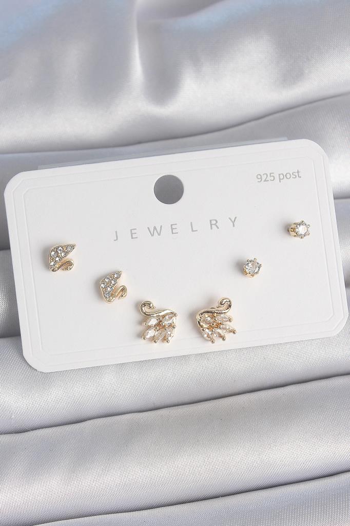 Pirinç Gold Renk Zirkon Taşlı Kuğu Model 925 Ayar Gümüş Çivi Kadın Küpe Seti - BKP10480