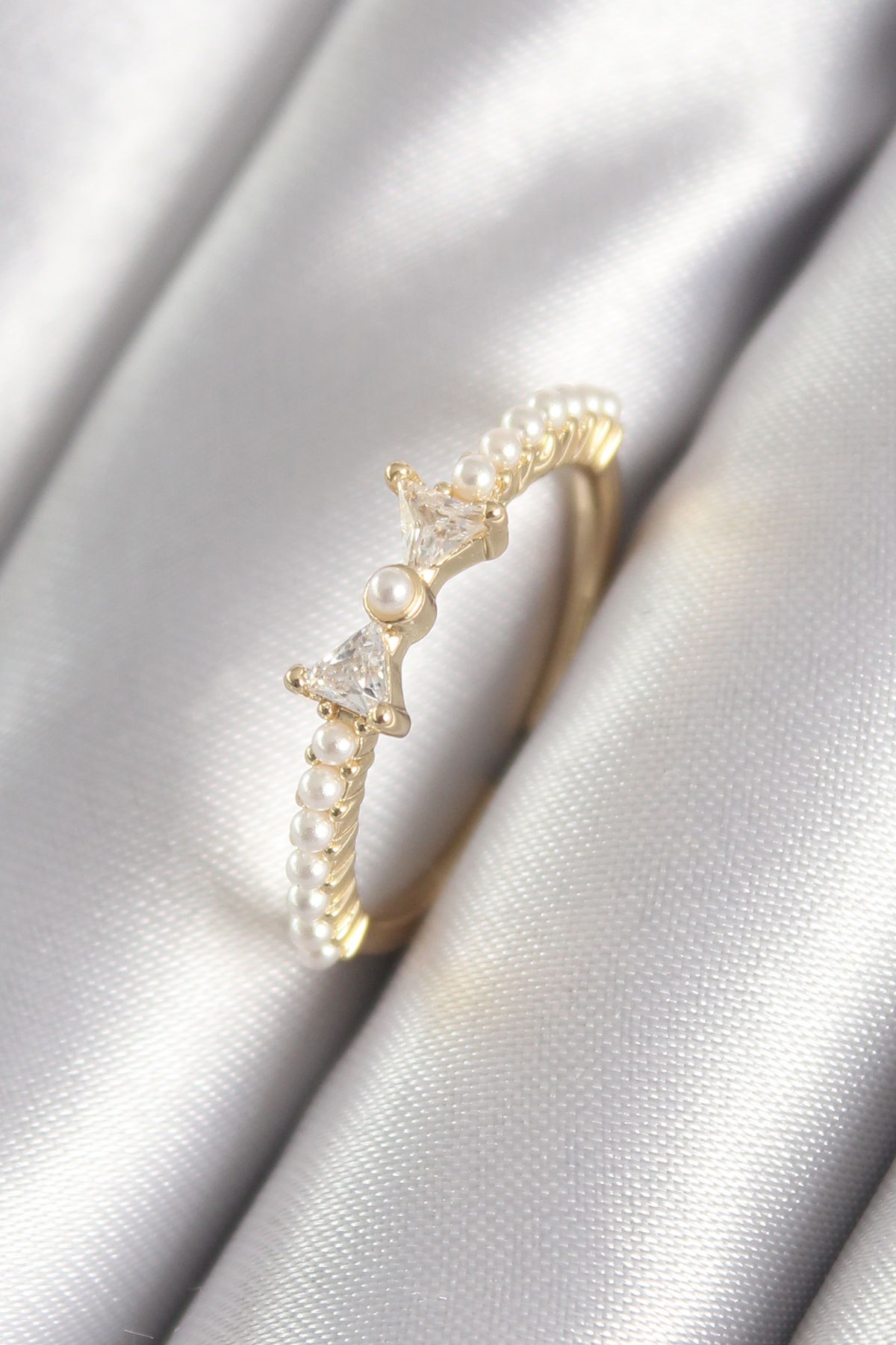 Pirinç Gold Renk Zirkon Taşlı Kurdele İnci Detay Kadın Yüzük - TJ-BYK3059
