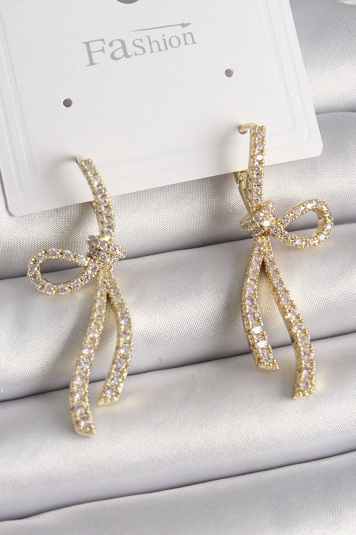 Pirinç Gold Renk Zirkon Taşlı Kurdele Model Kadın Küpe - TJ-BKP9897