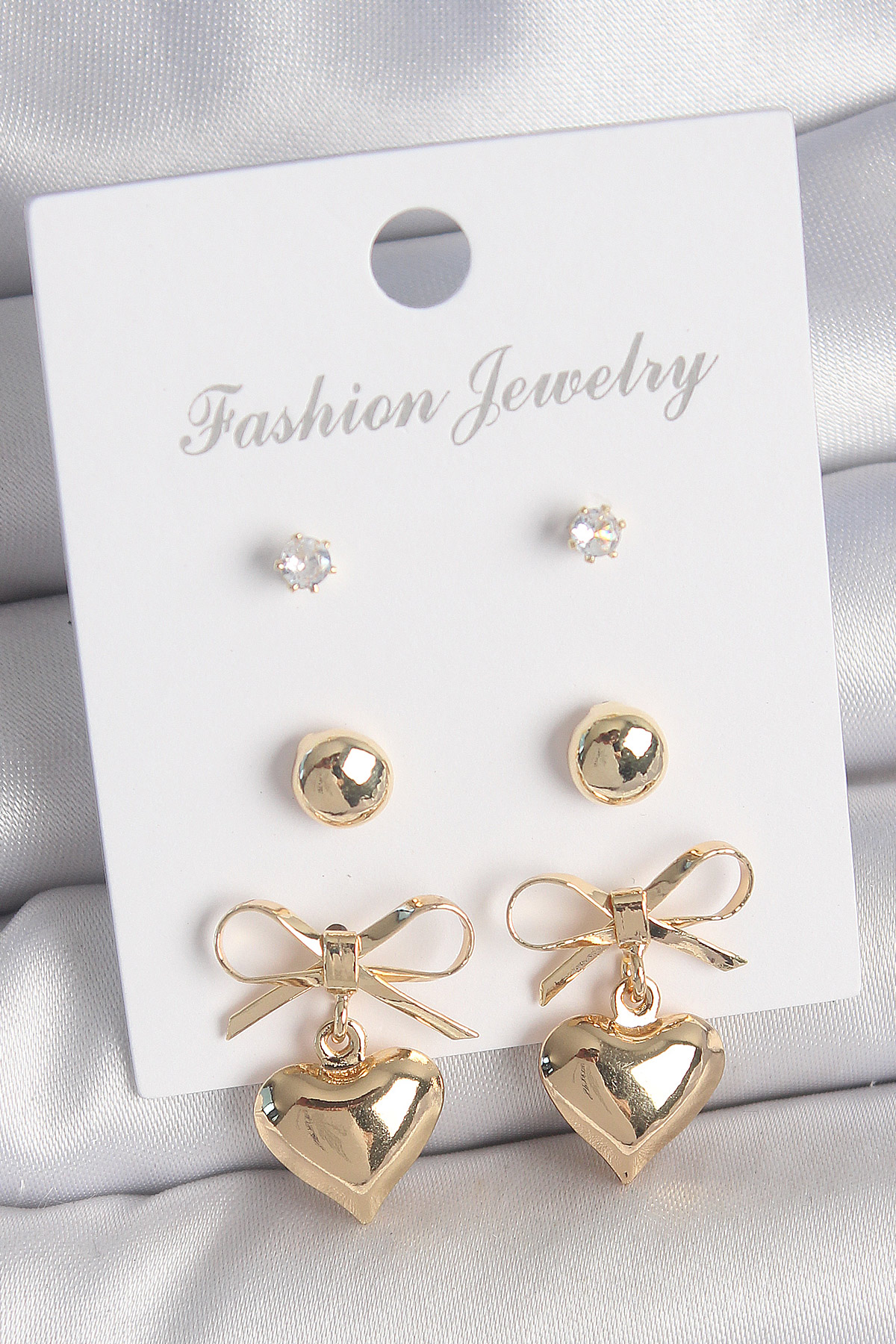 Pirinç Gold Renk Zirkon Taşlı Kurdele Sallantılı Kalp Model 3 Çift Kadın Küpe Seti - TJ-BKP10621
