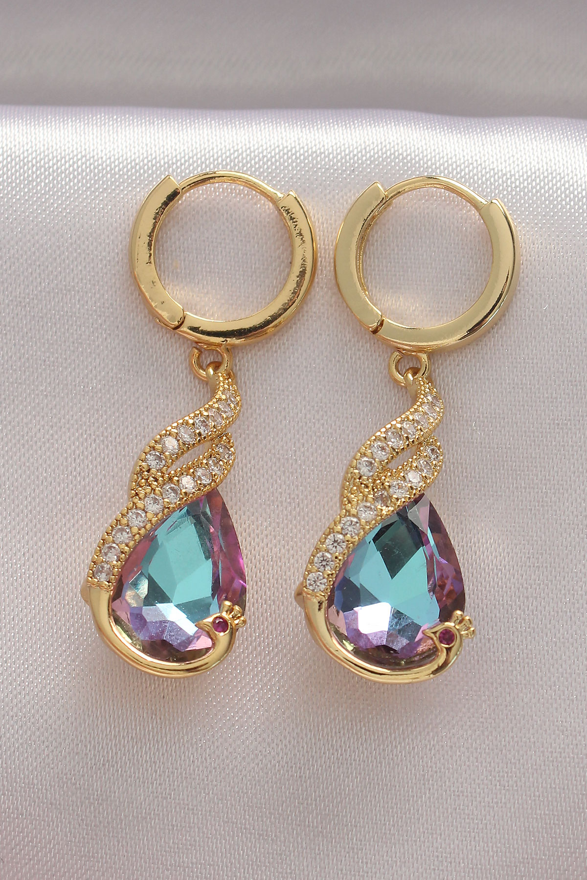 Pirinç Gold Renk Zirkon Taşlı Renkli Damla Tasarım Küpe - TJ-BKP8963