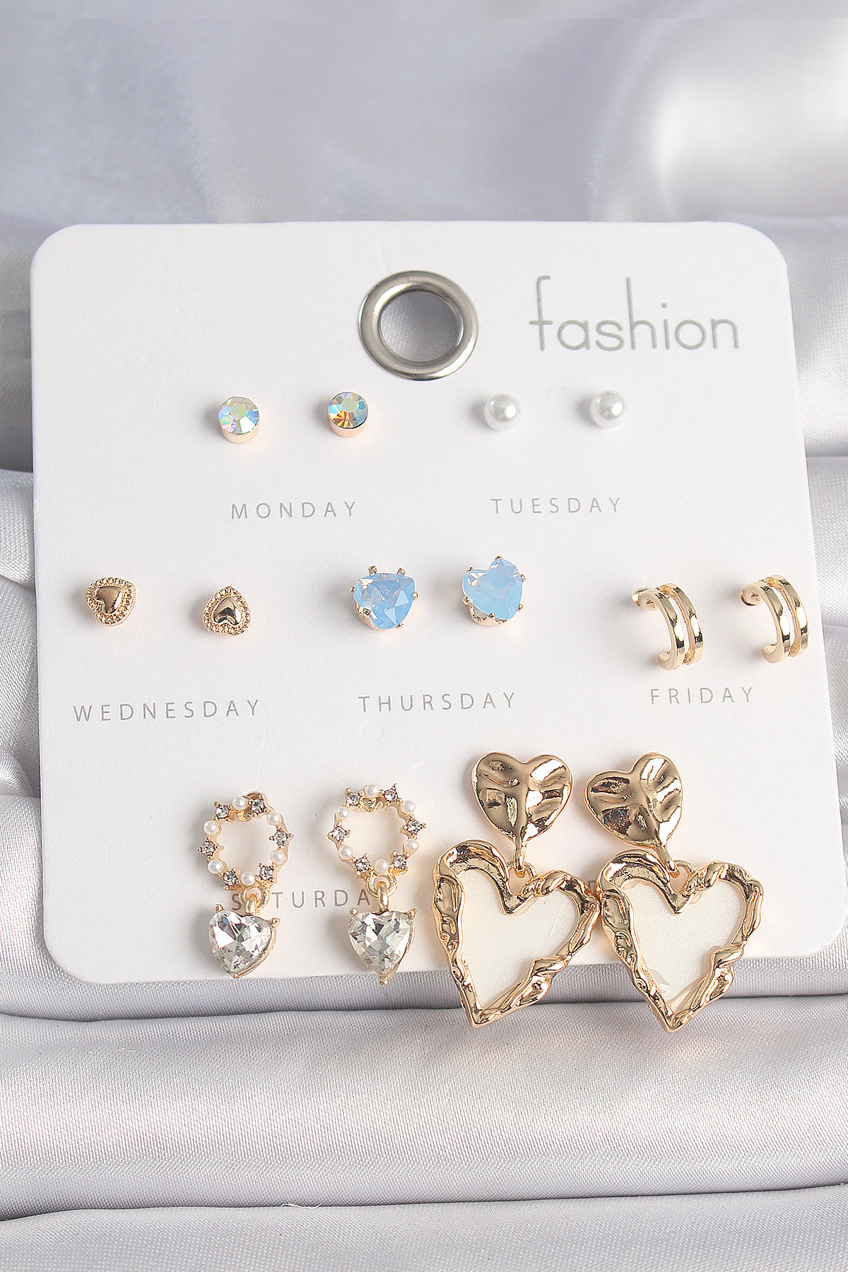 Pirinç Gold Renk Zirkon Taşlı Sallantı Beyaz Sedefli Kalp Model 7 Çift Kadın Küpe Seti - TJ-BKP10161