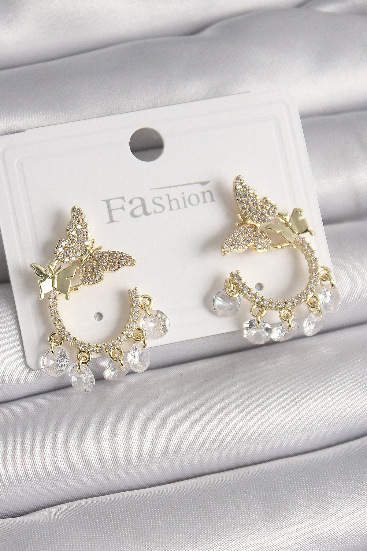 Pirinç Gold Renk Zirkon Taşlı Sallantı Detay Kelebek Model Kadın Küpe - TJ-BKP9901