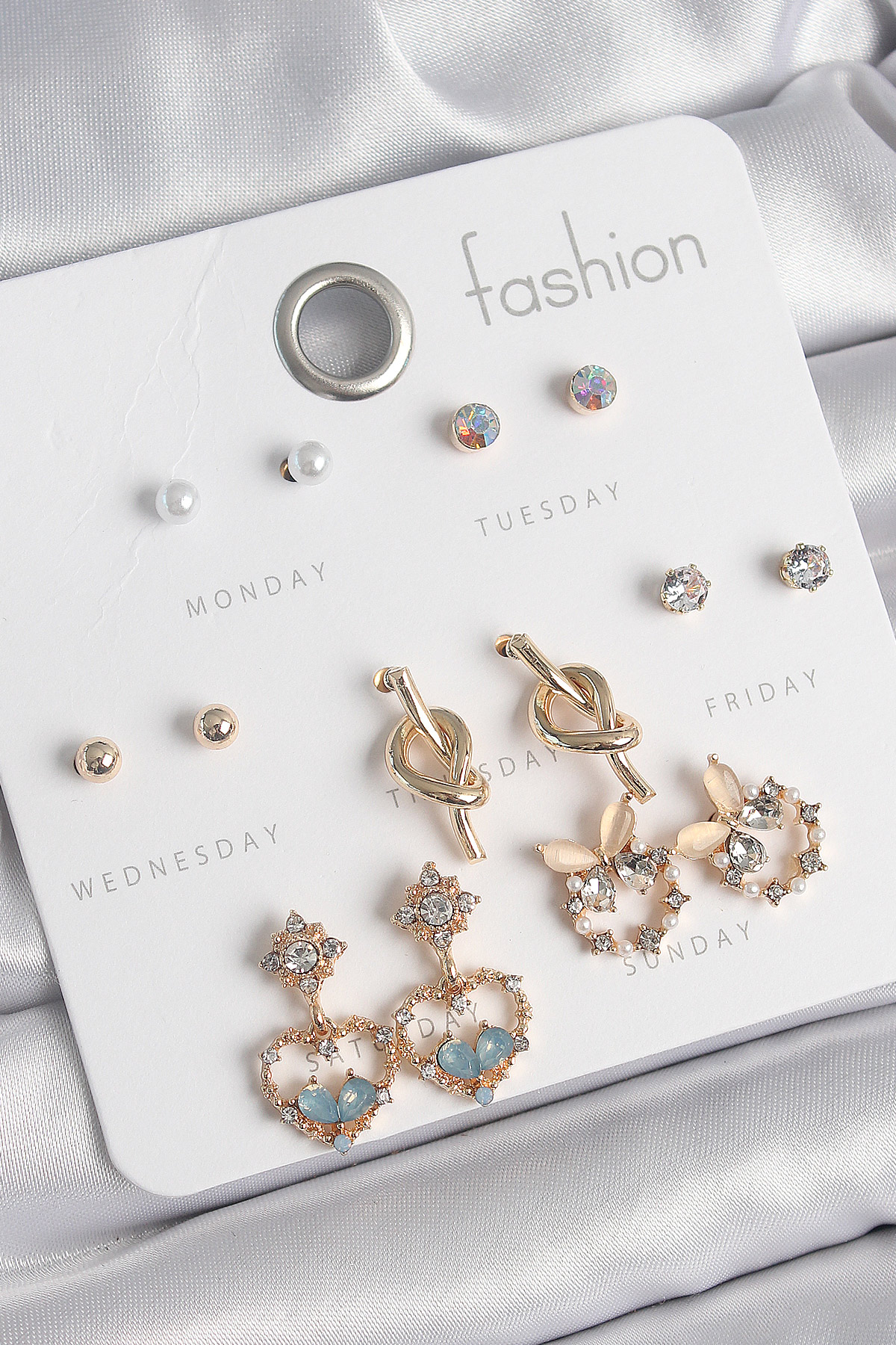 Pirinç Gold Renk Zirkon Taşlı Sallantı Kalp Figür Düğüm Detay 7 Çift Kadın Küpe Seti - TJ-BKP10542