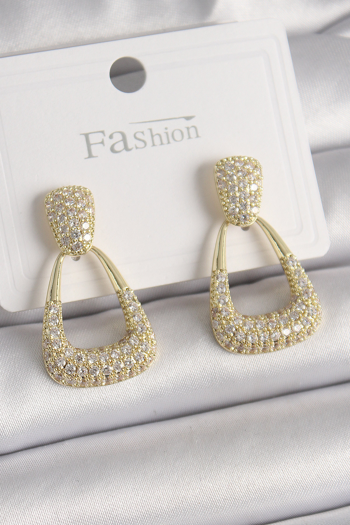 Pirinç Gold Renk Zirkon Taşlı Sallantı Üçgen Model Kadın Küpe - TJ-BKP9931