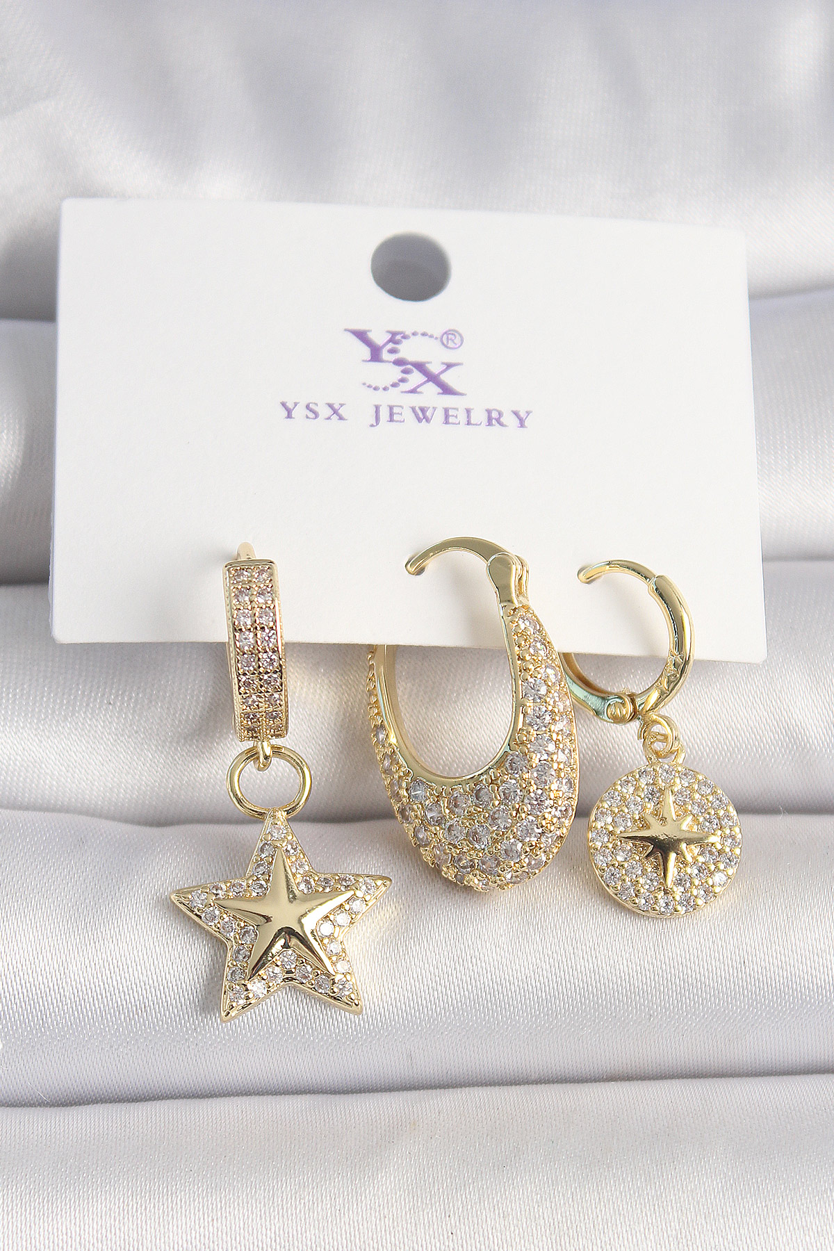 Pirinç Gold Renk Zirkon Taşlı Sallantı Yıldız Model Kutup Yıldız İşleme Detay 3'Lü Kadın Küpe - TJ-BKP10431