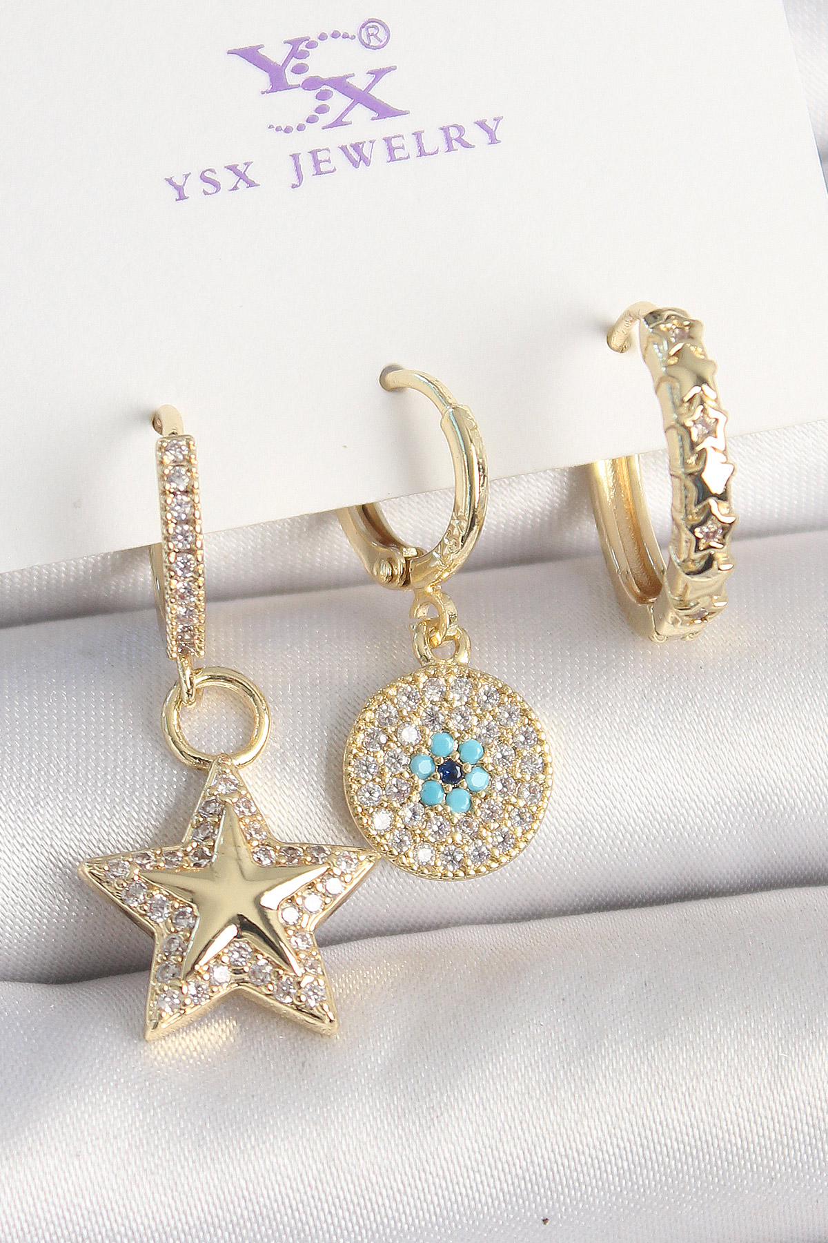 Pirinç Gold Renk Zirkon Taşlı Sallantı Yıldız Model Nazar Boncuk Detay 3'Lü Kadın Kombin Küpe - TJ-BKP10445