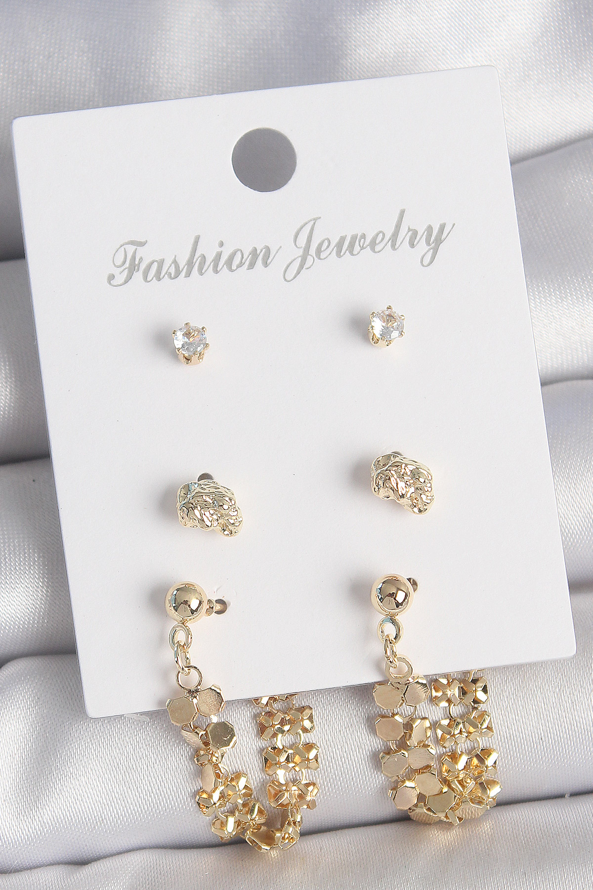Pirinç Gold Renk Zirkon Taşlı Sallantılı Pul Model 3 Çift Kadın Küpe Seti - TJ-BKP10614