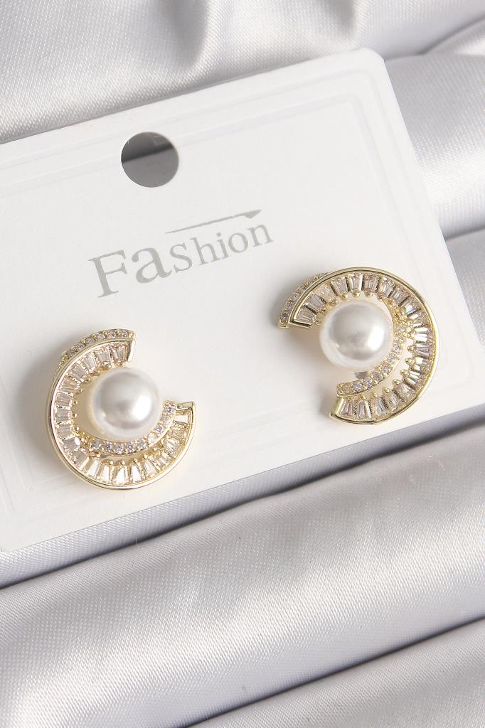 Pirinç Gold Renk Zirkon Taşlı Salyangoz Model İnci Detay Kadın Küpe - TJ-BKP9786