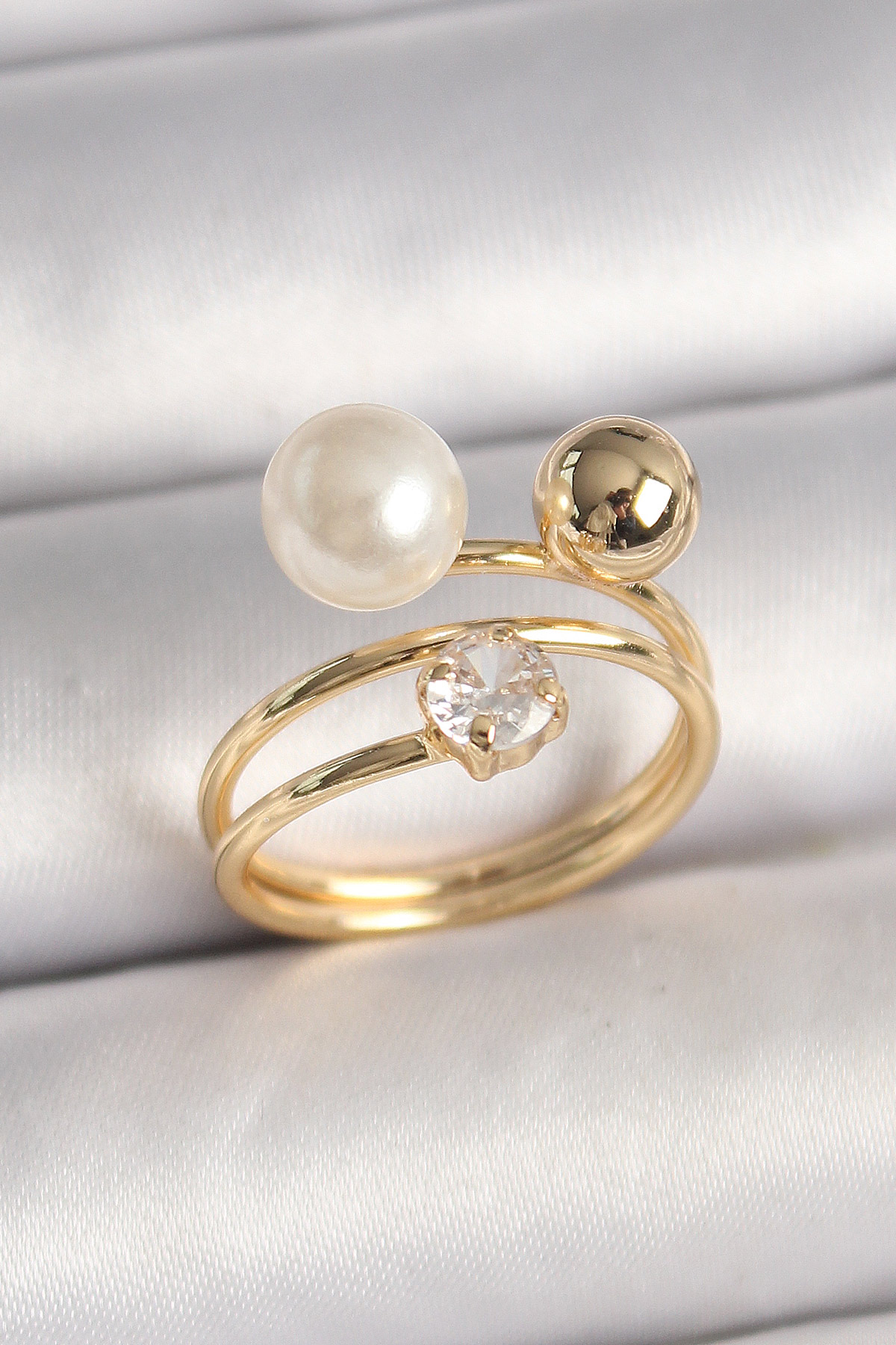 Pirinç Gold Renk Zirkon Taşlı Top İnci Model Kadın Yüzük - TJ-BYK3679