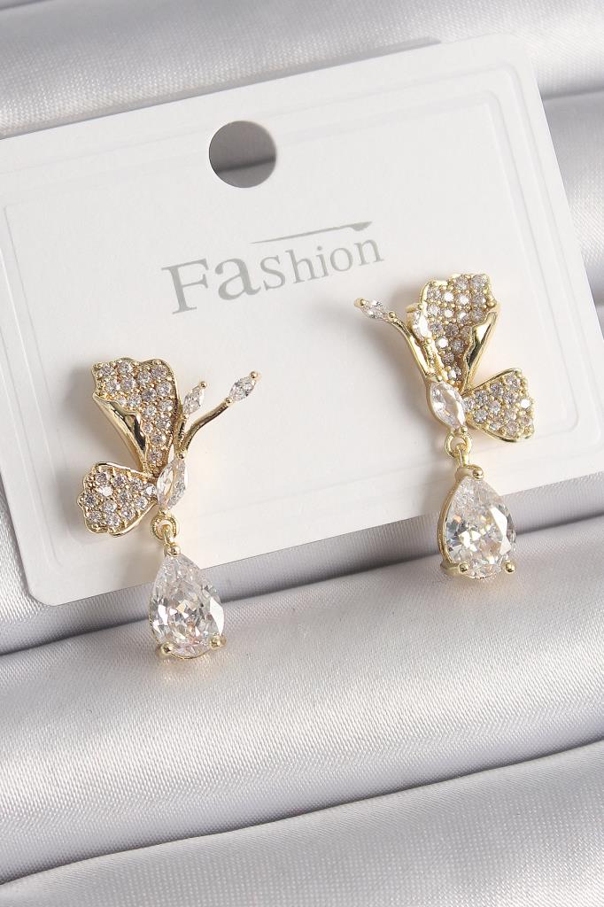 Pirinç Gold Renk Zirkon Taşlı Turna Kuşu Model Sallantı Detay Kadın Küpe - TJ-BKP9919