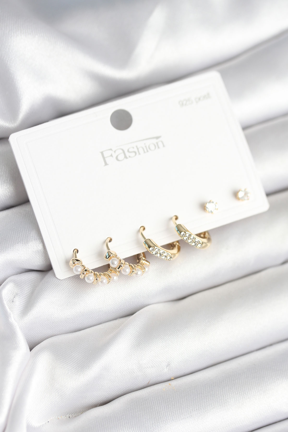 Pirinç Gold Renk Zirkon Taşlı ve İncili Model 925 Ayar Gümüş Çivi Kadın Küpe Seti - TJ-BKP11277