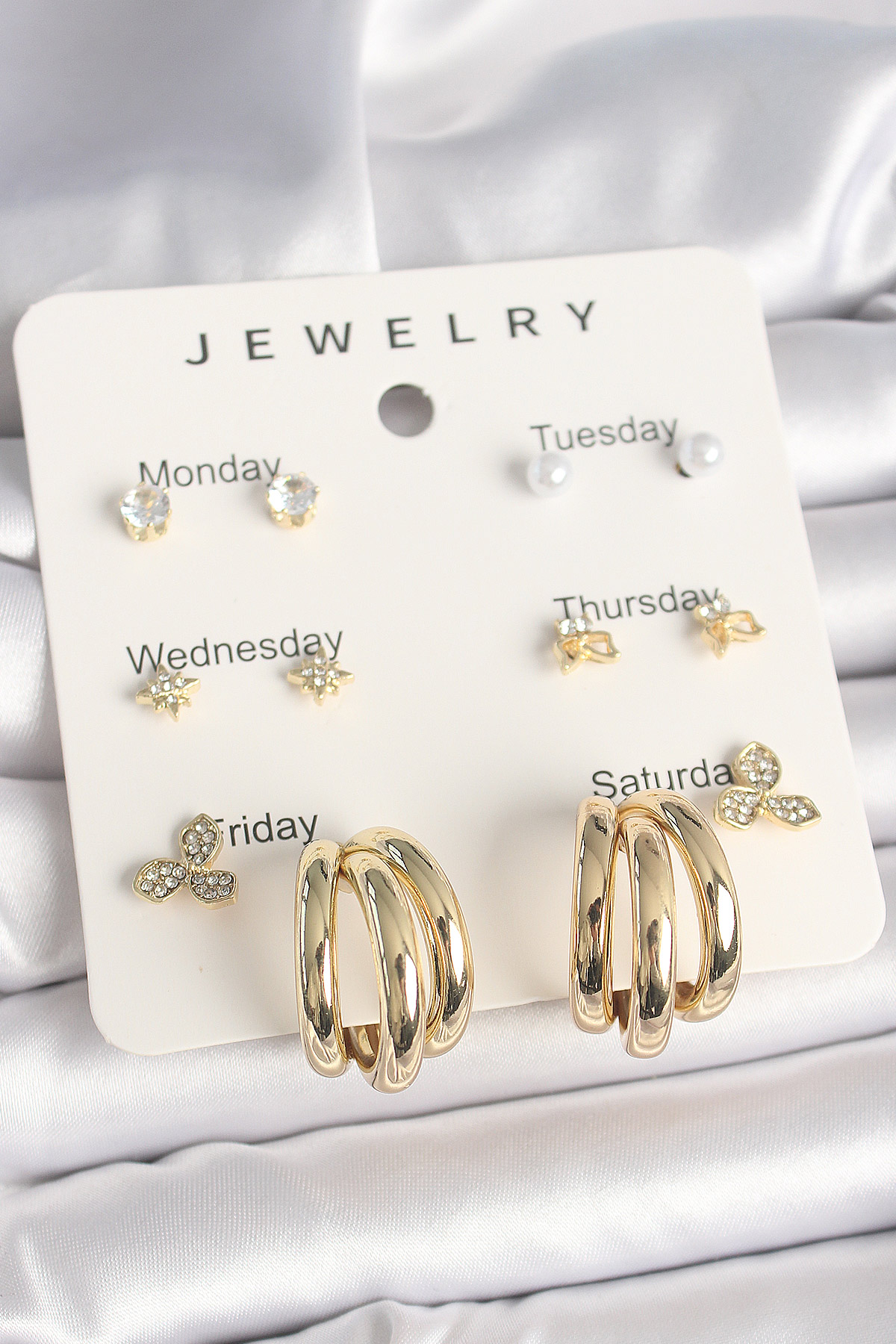 Pirinç Gold Renk Zirkon Taşlı Yıldız Detay Halka Figür 7'Li Set Kadın Küpe - TJ-BKP10321