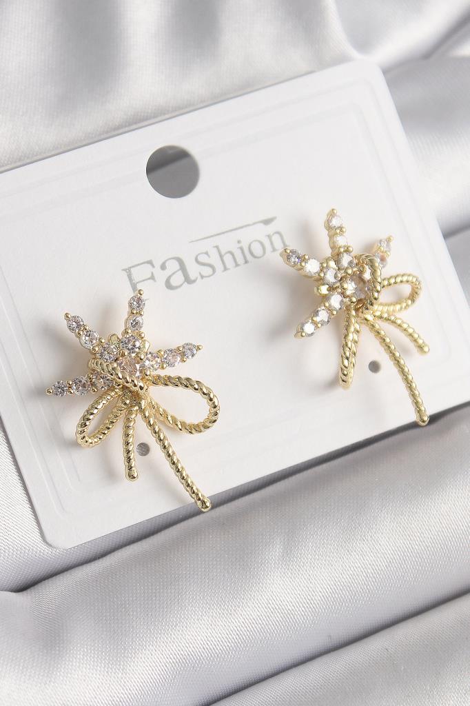 Pirinç Gold Renk Zirkon Taşlı Yıldız Düğüm Model Kadın Küpe - TJ-BKP9951