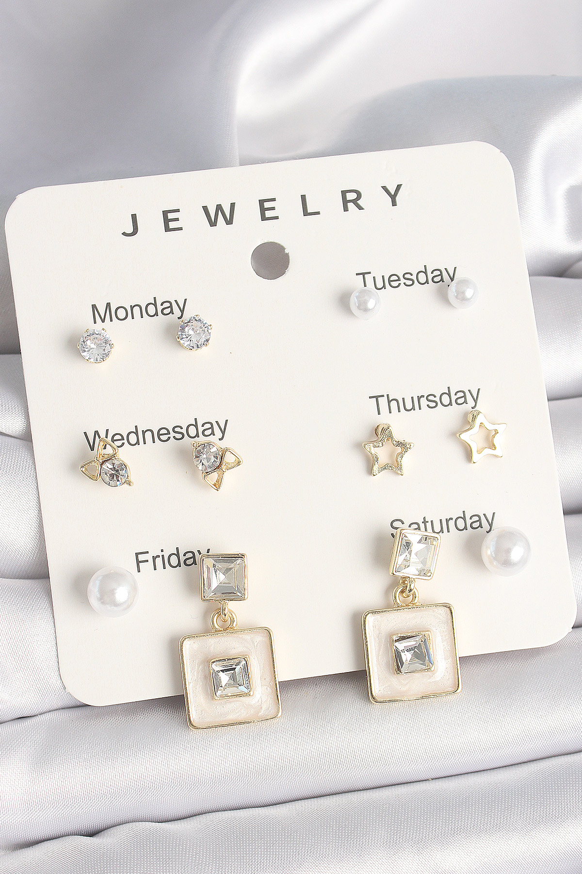 Pirinç Gold Renk Zirkon Taşlı Yıldız Figür Sallantı Beyaz Mineli Model 7'Li Kadın Küpe Seti - TJ-BKP10323