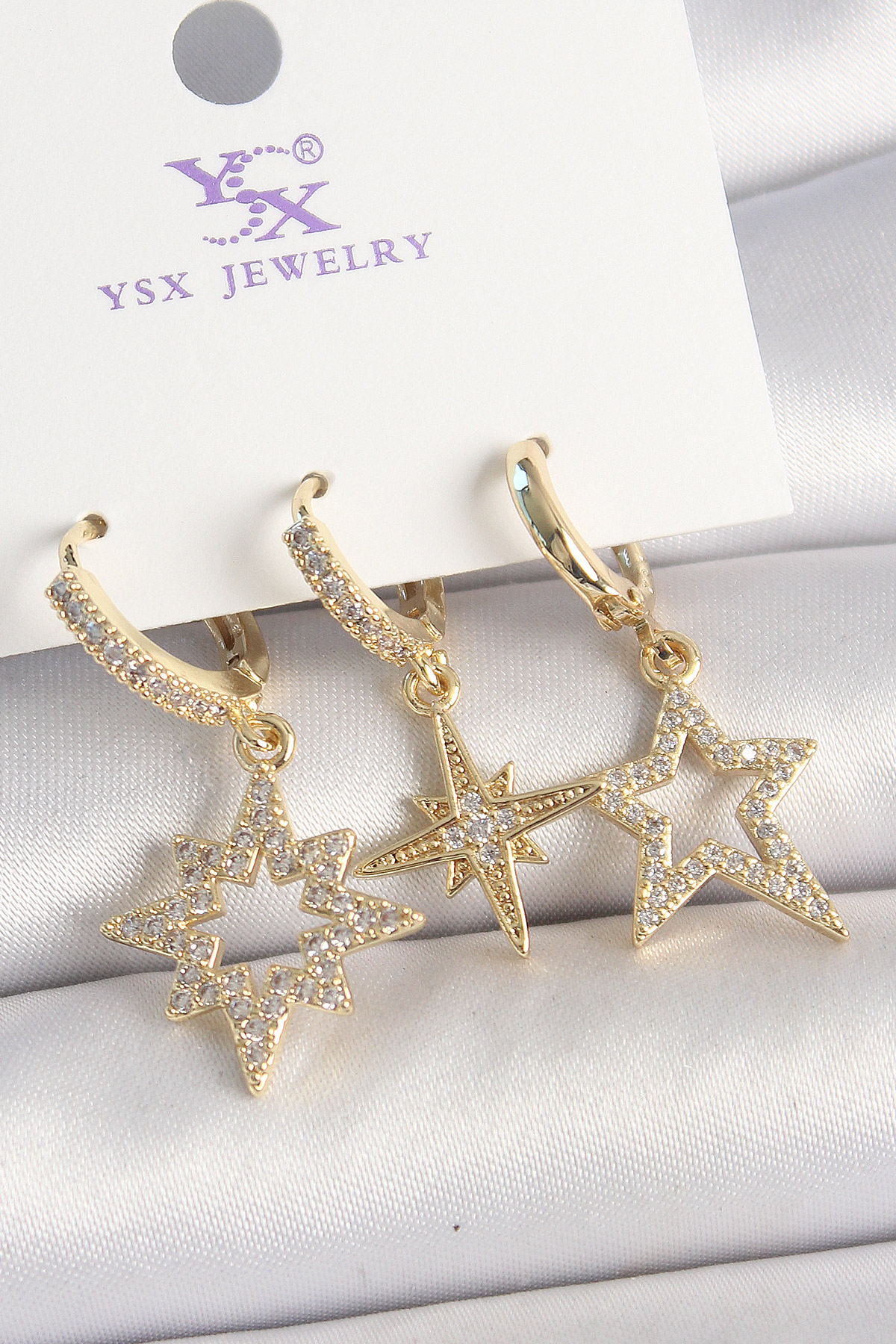 Pirinç Gold Renk Zirkon Taşlı Yıldız Model 3'Lü Kadın Kombin Küpe - TJ-BKP10447