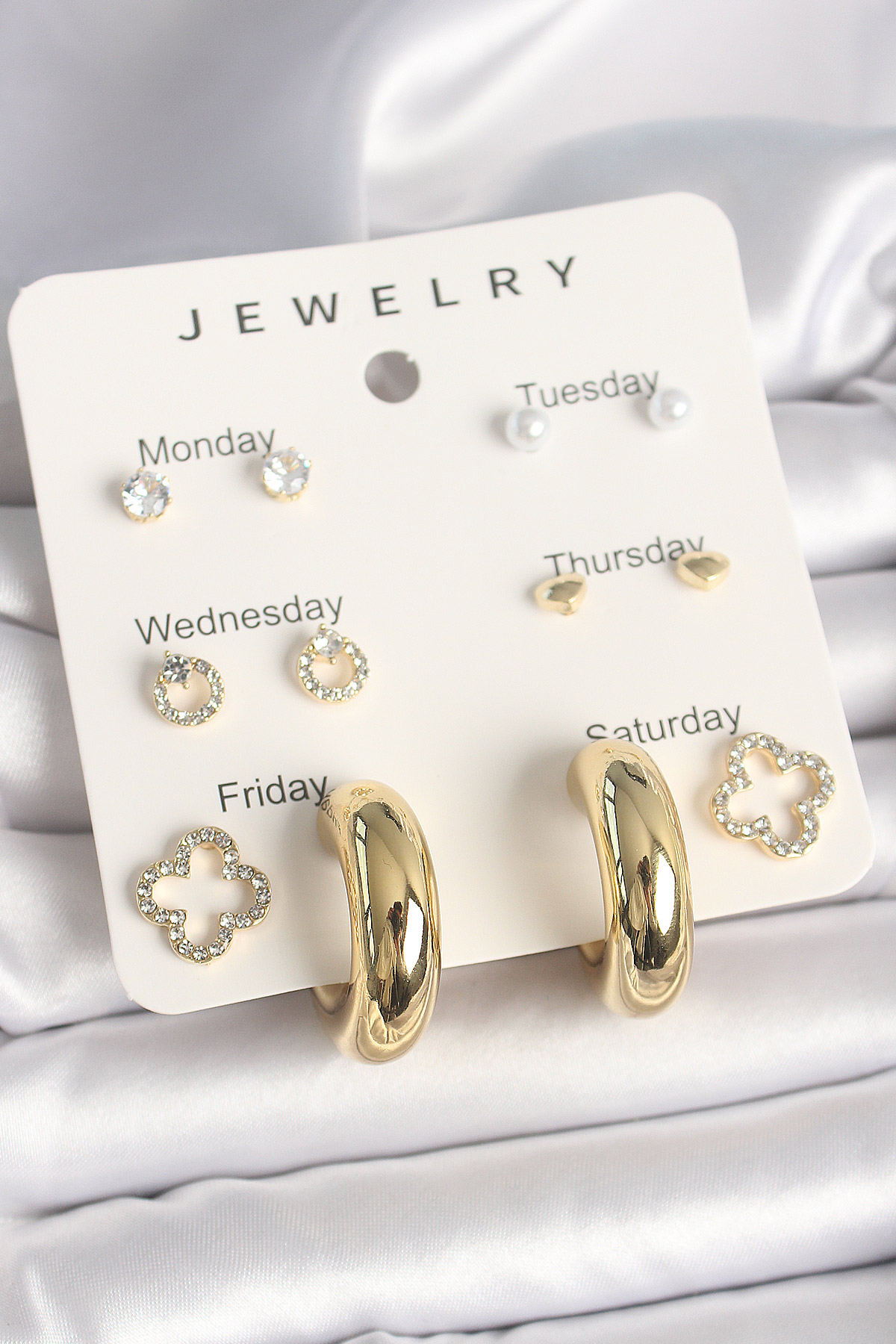 Pirinç Gold Renk Zirkon Taşlı Yonca Halka Figür 7'Li Set Kadın Küpe - TJ-BKP10322