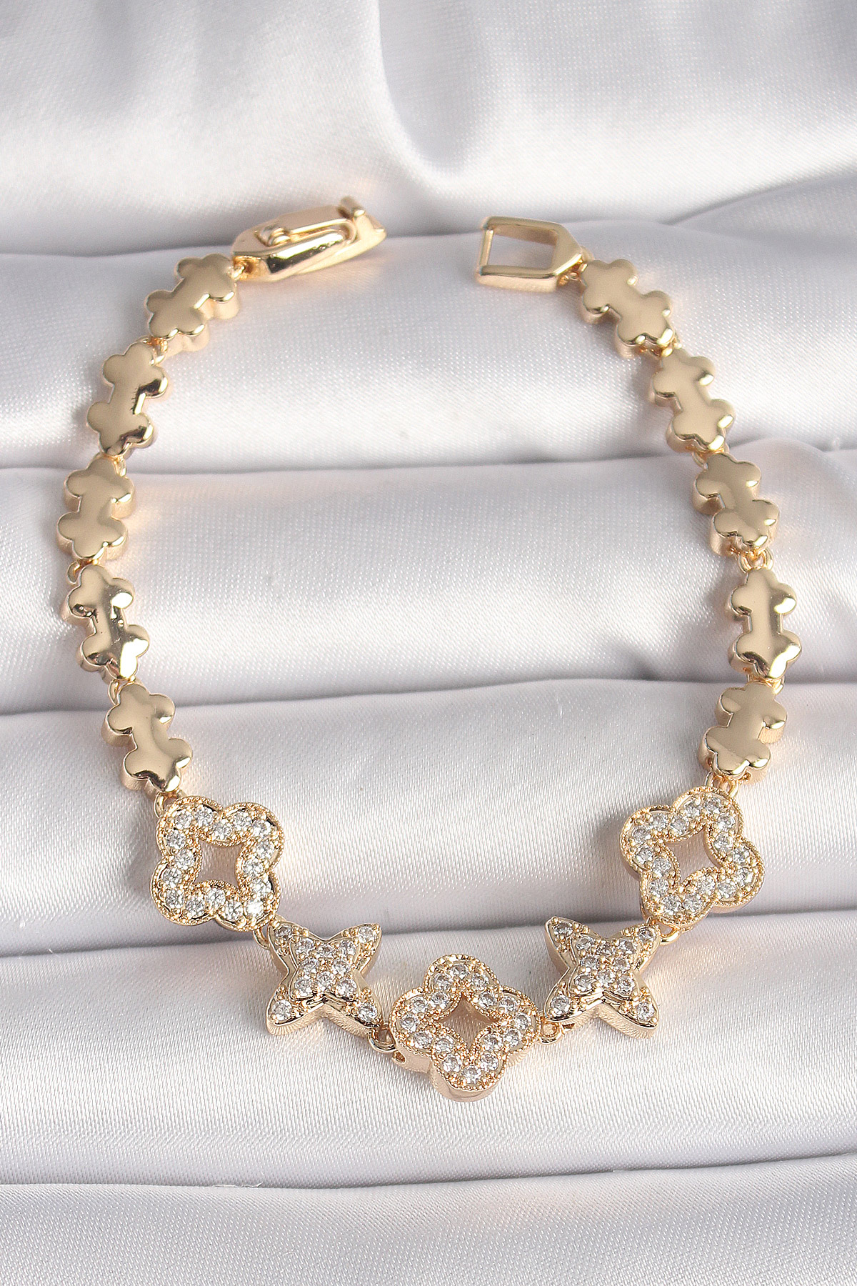 Pirinç Gold Renk Zirkon Taşlı Yonca Yıldız Model Kadın Bileklik - TJ-BB6838