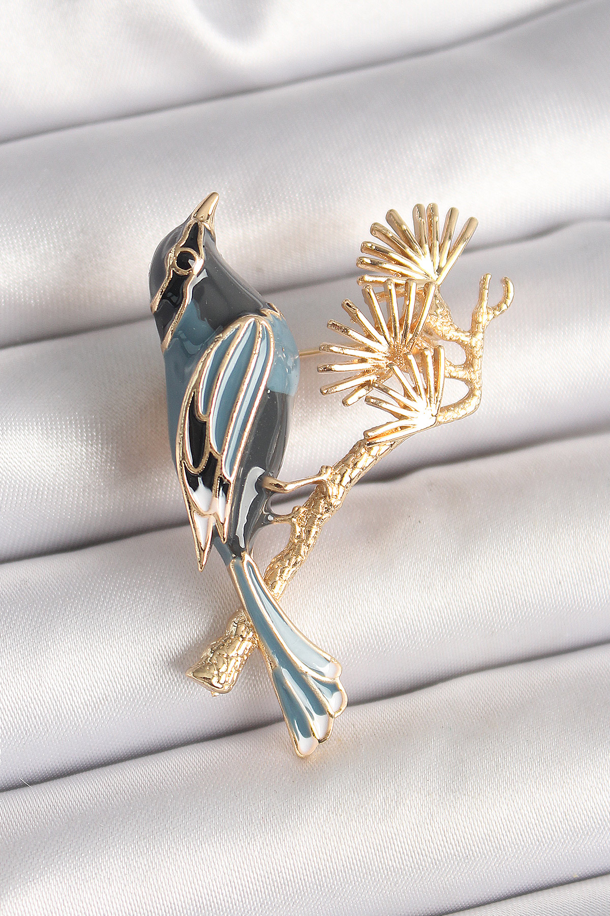 Pirinç Gri Kuş Model Dal Detay Kadın Broş - TJ-BR432