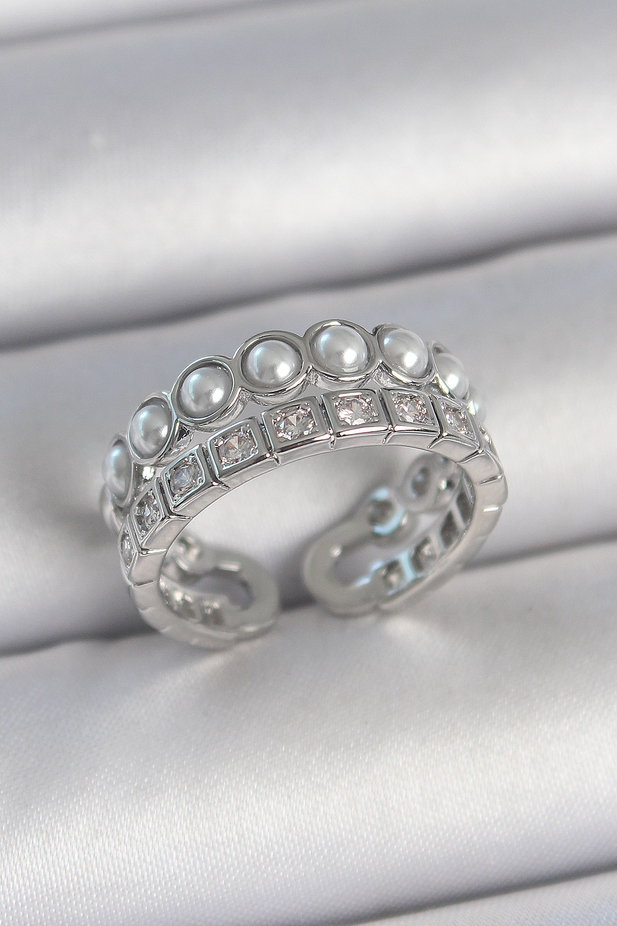Pirinç Gümüş Renk 2'Li Sıra Zirkon Taşlı Ve İncili Ayarlanabilir Kadın Yüzük - TJ-BYK3720
