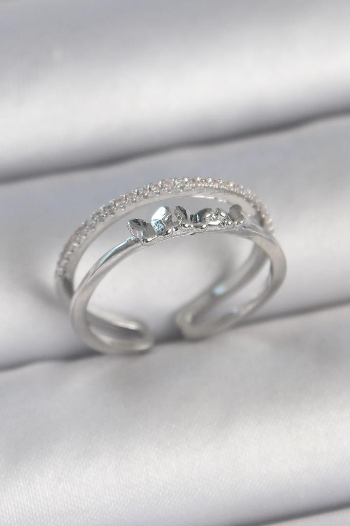 Pirinç Gümüş Renk 2'Li Zirkon Taş Detaylı Kelebek Figür Ayarlanabilir Model Kadın Yüzük - BYK3732