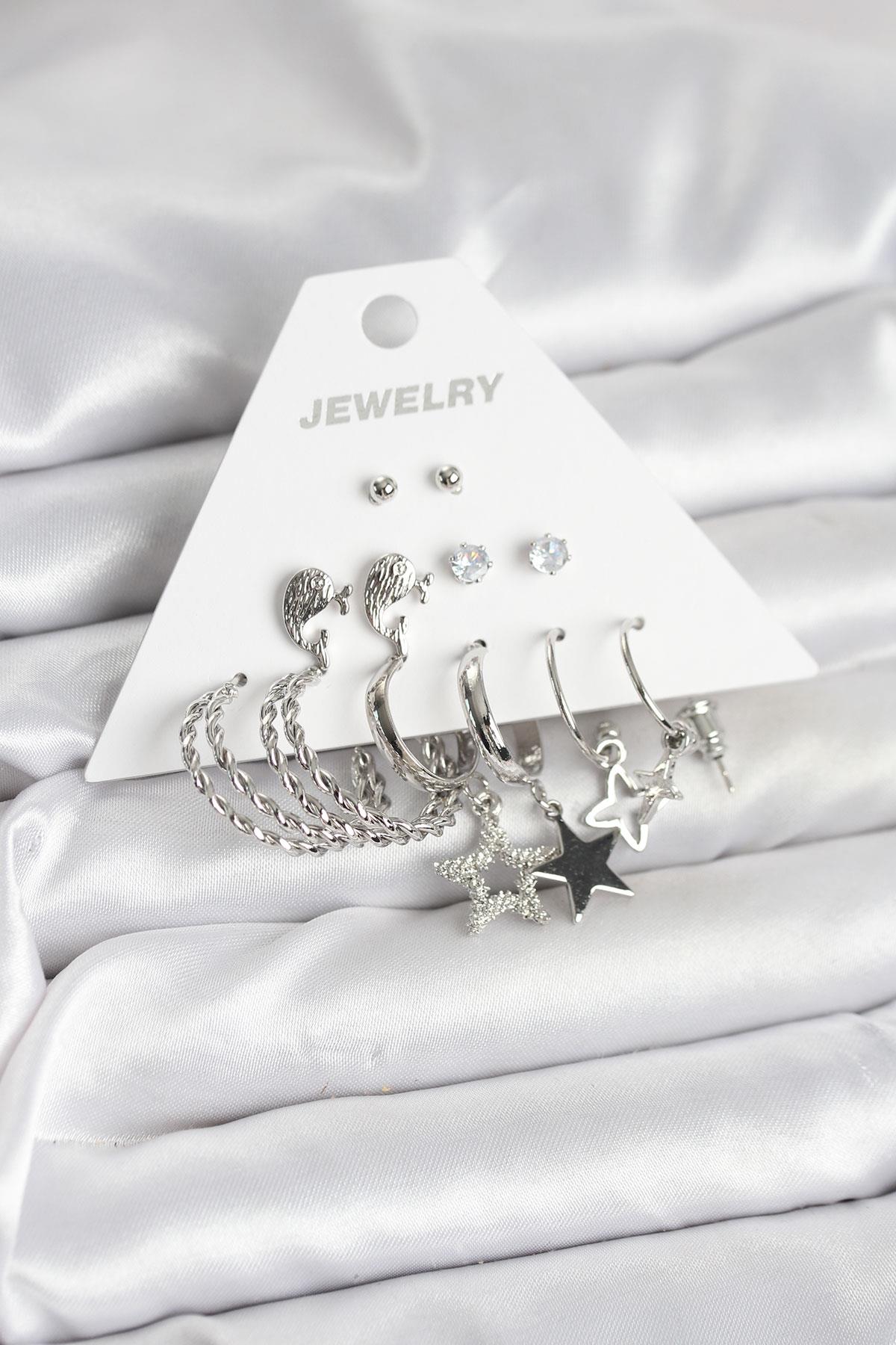 Pirinç Gümüş Renk 6'lı Kadın Küpe Seti - TJ-BKP11333