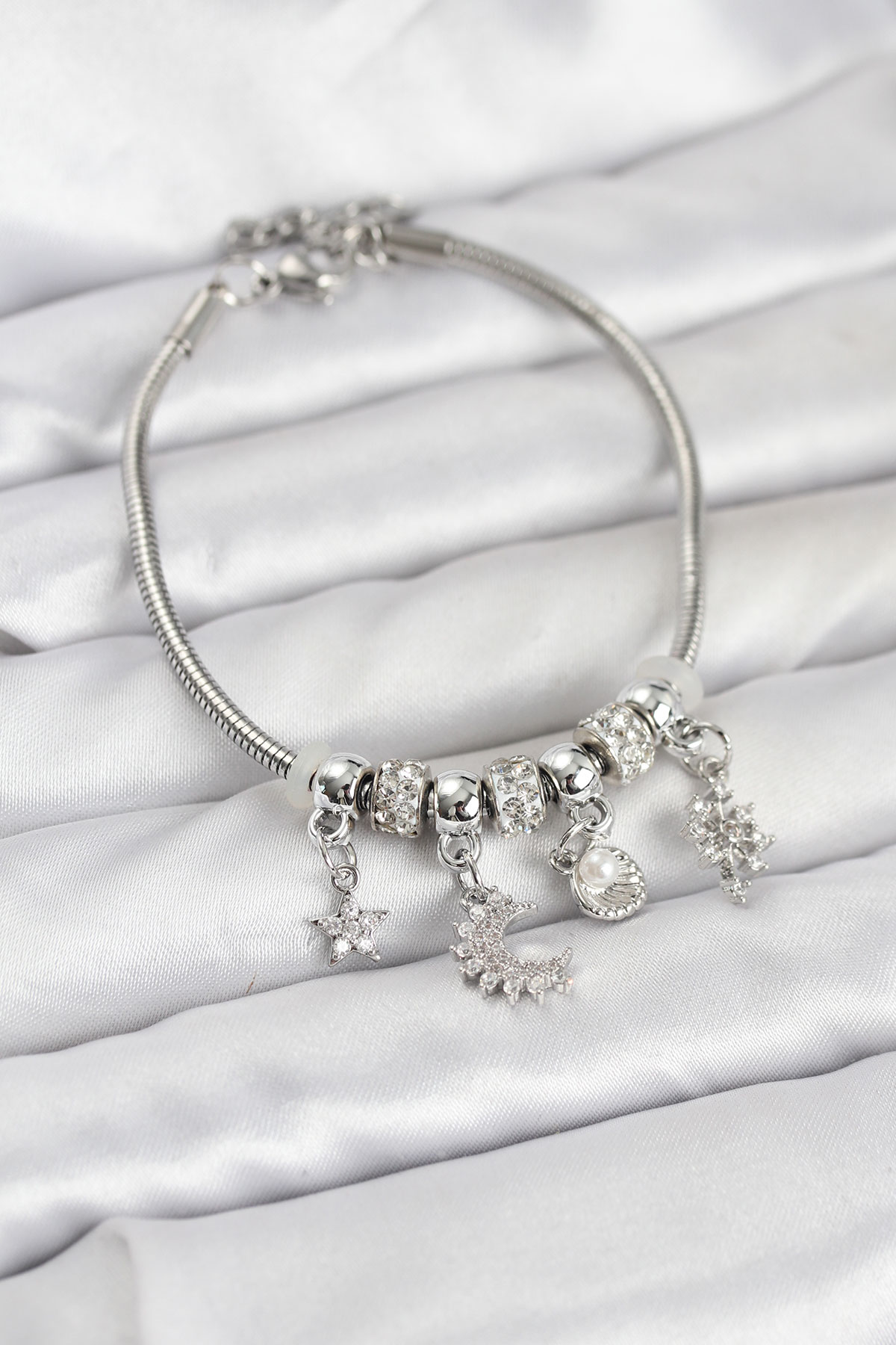 Pirinç Gümüş Renk Ay Charm Model Charmlı Kadın Bileklik - TJ-BB8174