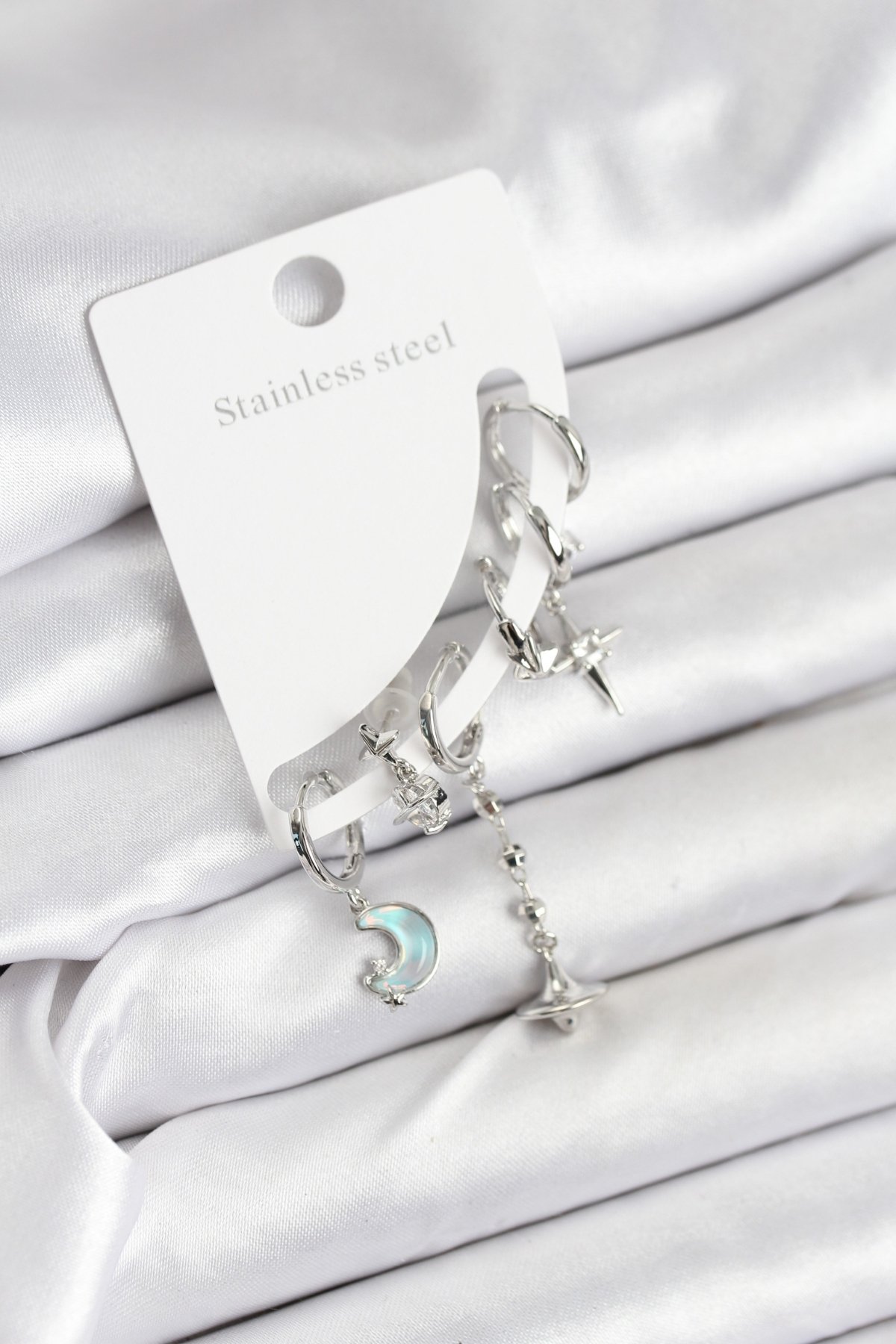 Pirinç Gümüş Renk Ay Model Kadın Set Küpe - TJ-BKP11220