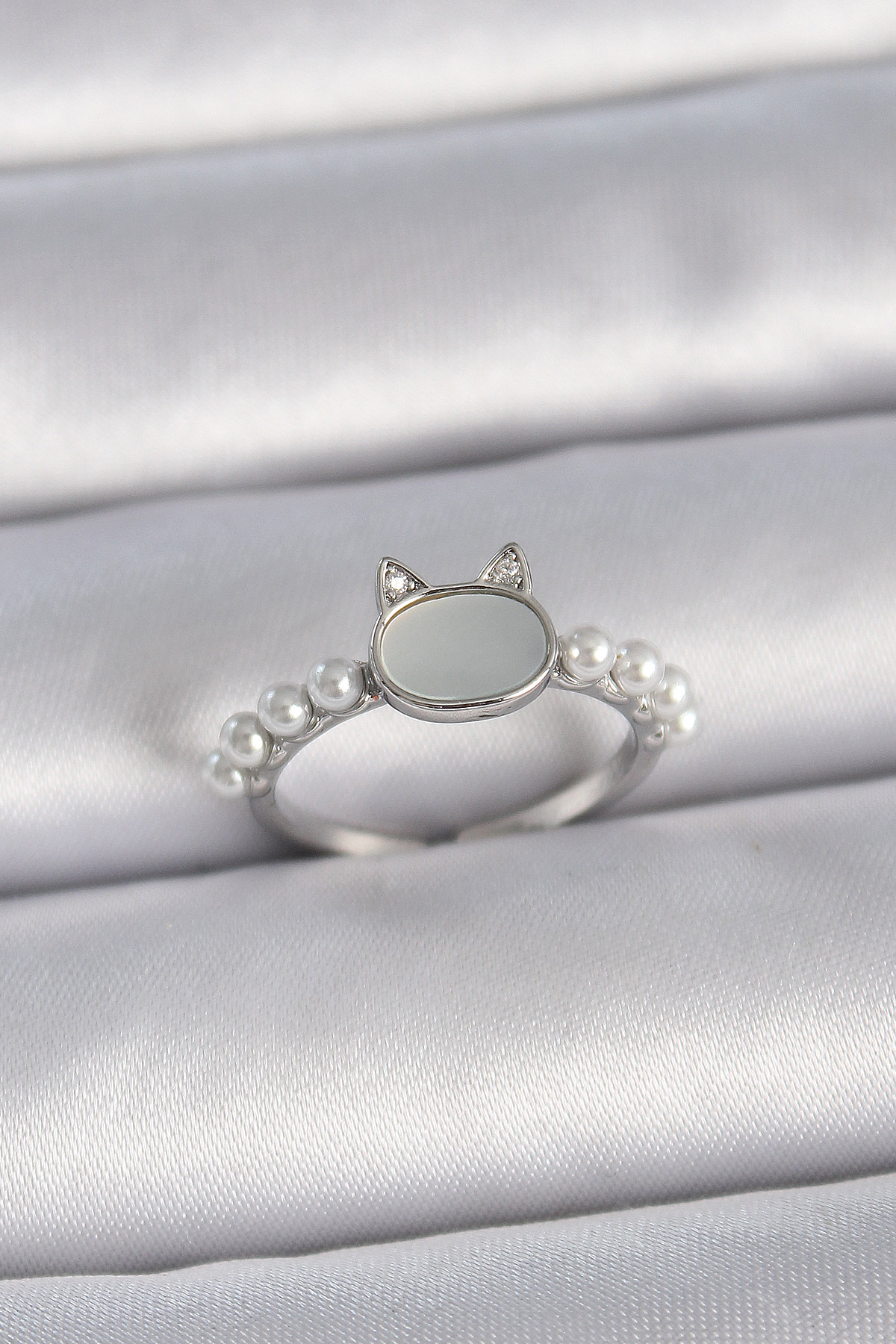 Pirinç Gümüş Renk Ayarlanabilir Beyaz Mineli Kedi Model İnci Detay Kadın Yüzük - TJ-BYK3387