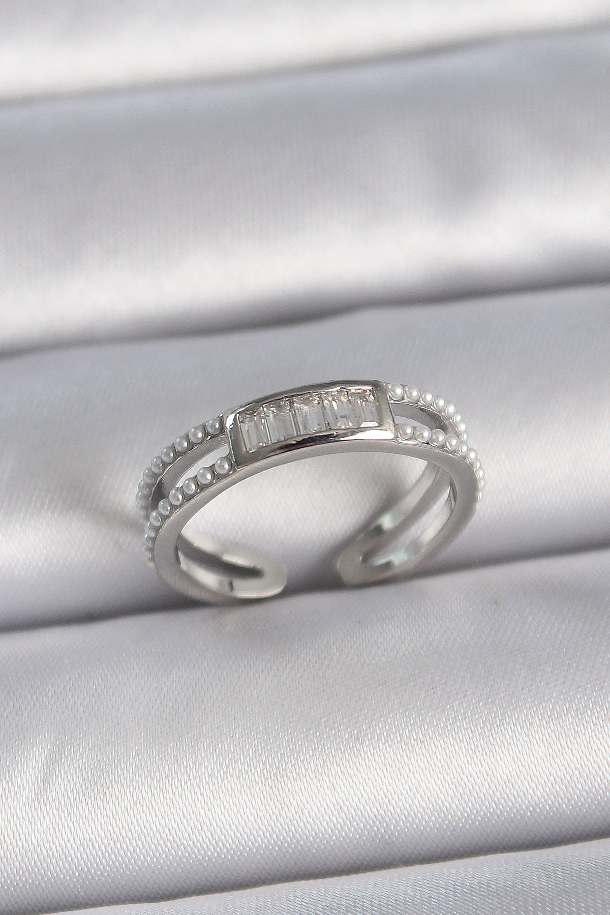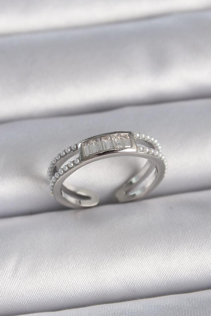 Pirinç Gümüş Renk Ayarlanabilir Sıralı İncili Zirkon Taşlı Kadın Yüzük - TJ-BYK3381