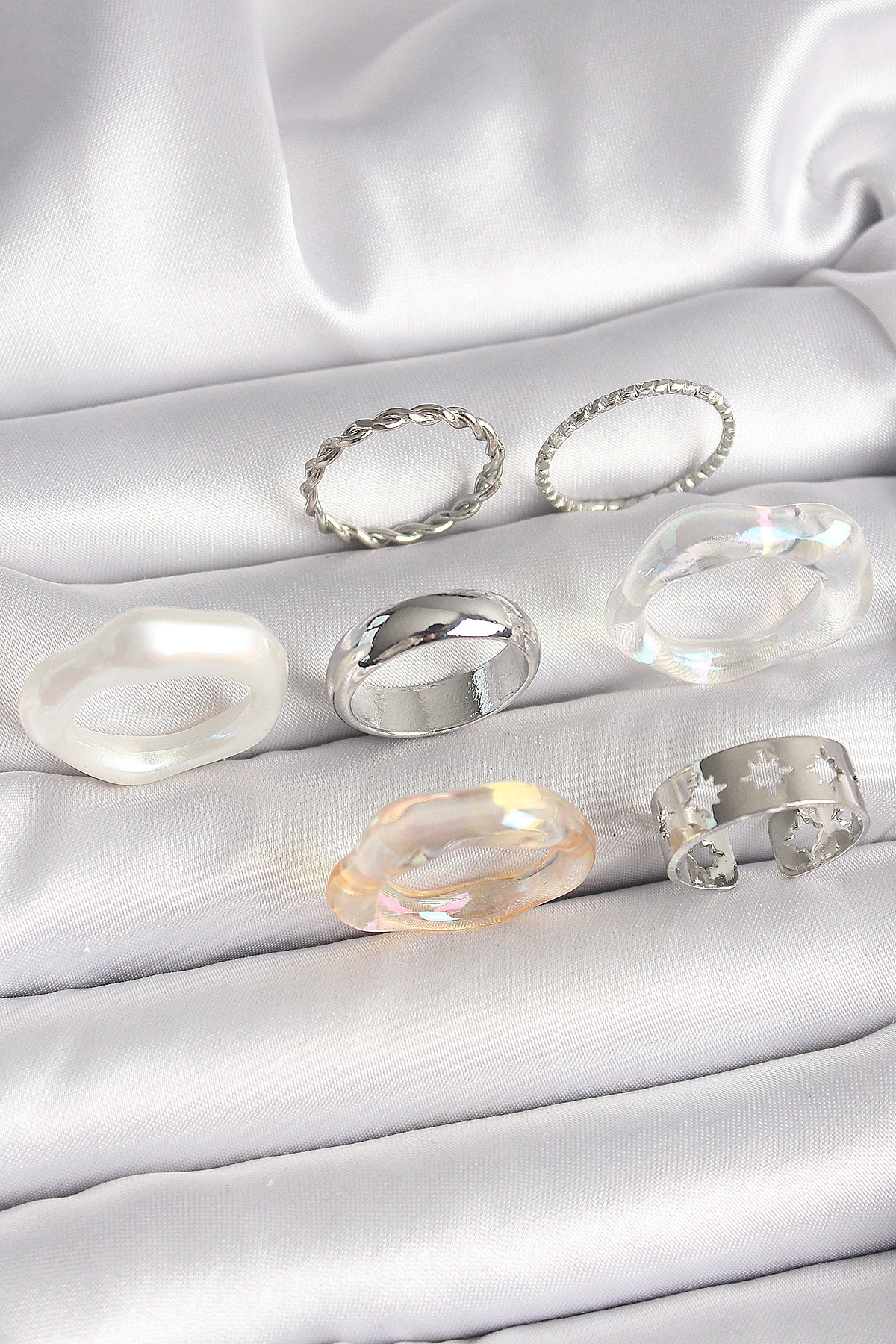 Pirinç Gümüş Renk Beyaz Akrilik Plastik Model Kutup Yıldız İşleme Detaylı Kadın Yüzük Kombini - TJ-BYK3655