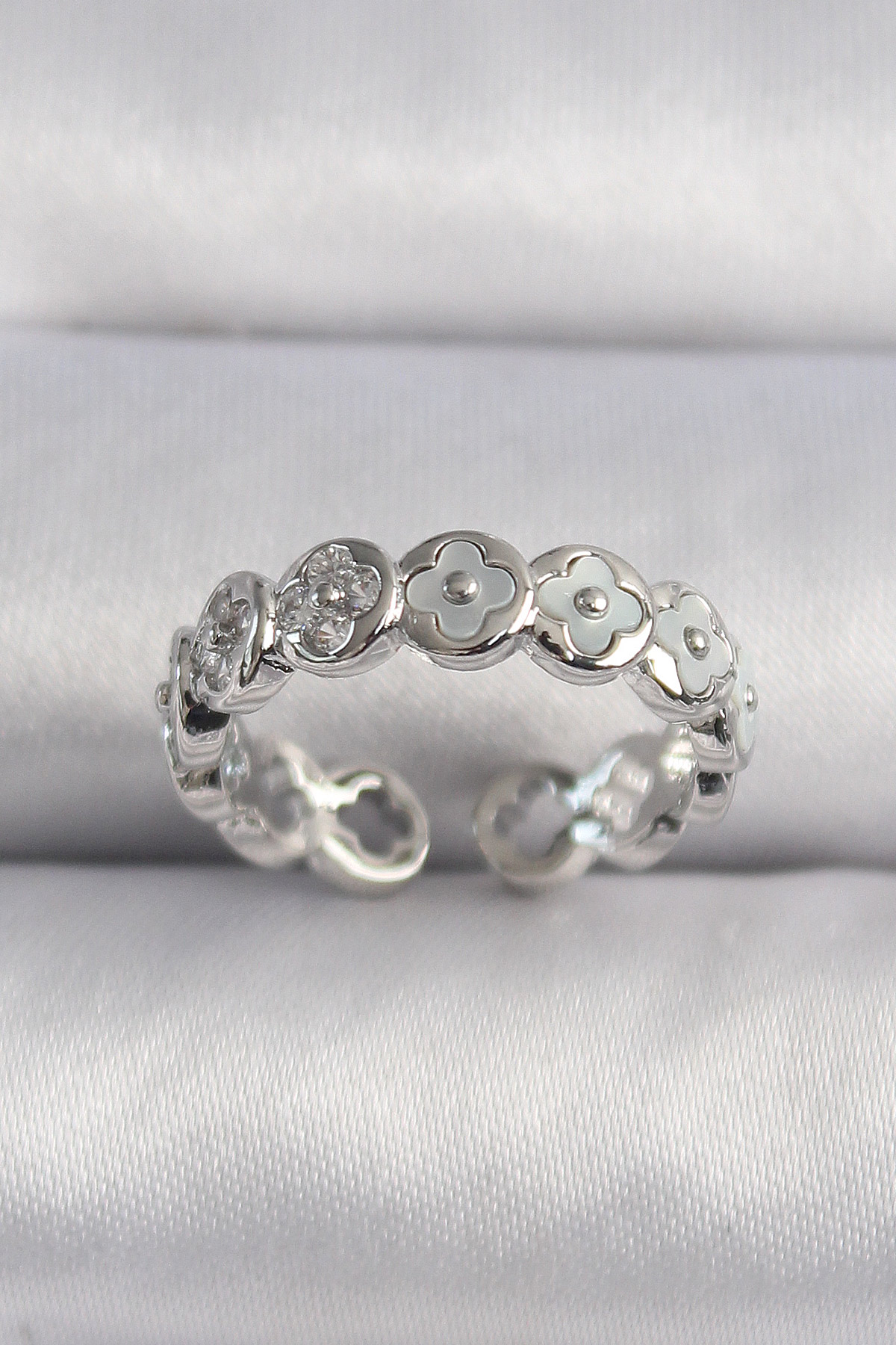 Pirinç Gümüş Renk Beyaz Sedefli Yonca Model Kadın Yüzük - TJ-BYK3497