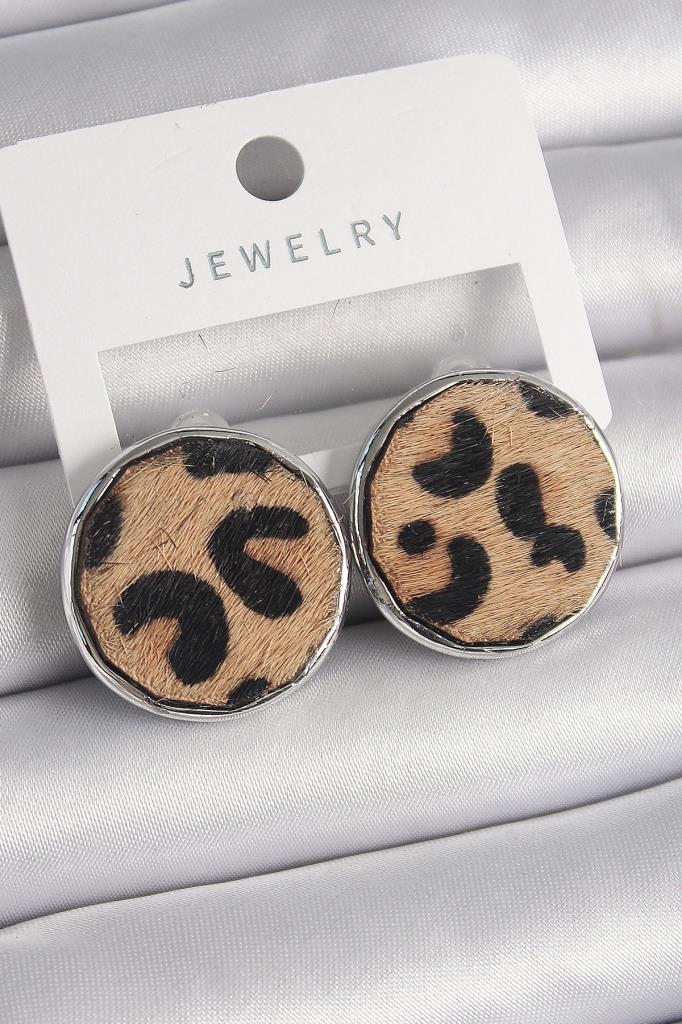 Pirinç Gümüş Renk Daire Plaka Model Leopar Desenli Kadın Küpe - TJ-BKP9890