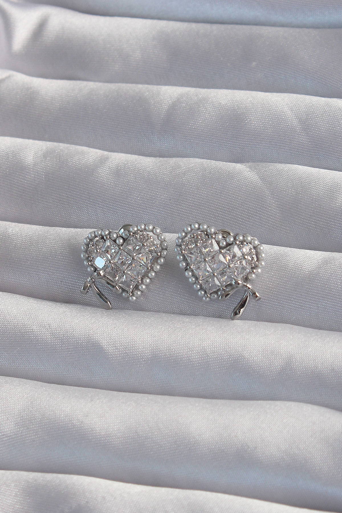 Pirinç Gümüş Renk Fiyonk Detay İncili Zirkon Taşlı Kalp Küpe - TJ-BKP9298