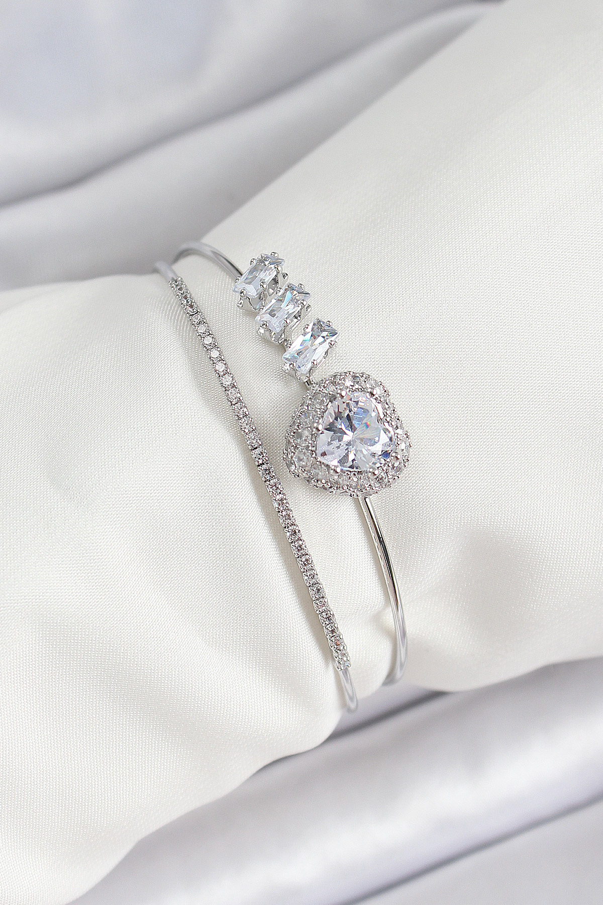 Pirinç Gümüş Renk Kalpli Zirkon Taşlı Kadın Bileklik - TJ-BB7065