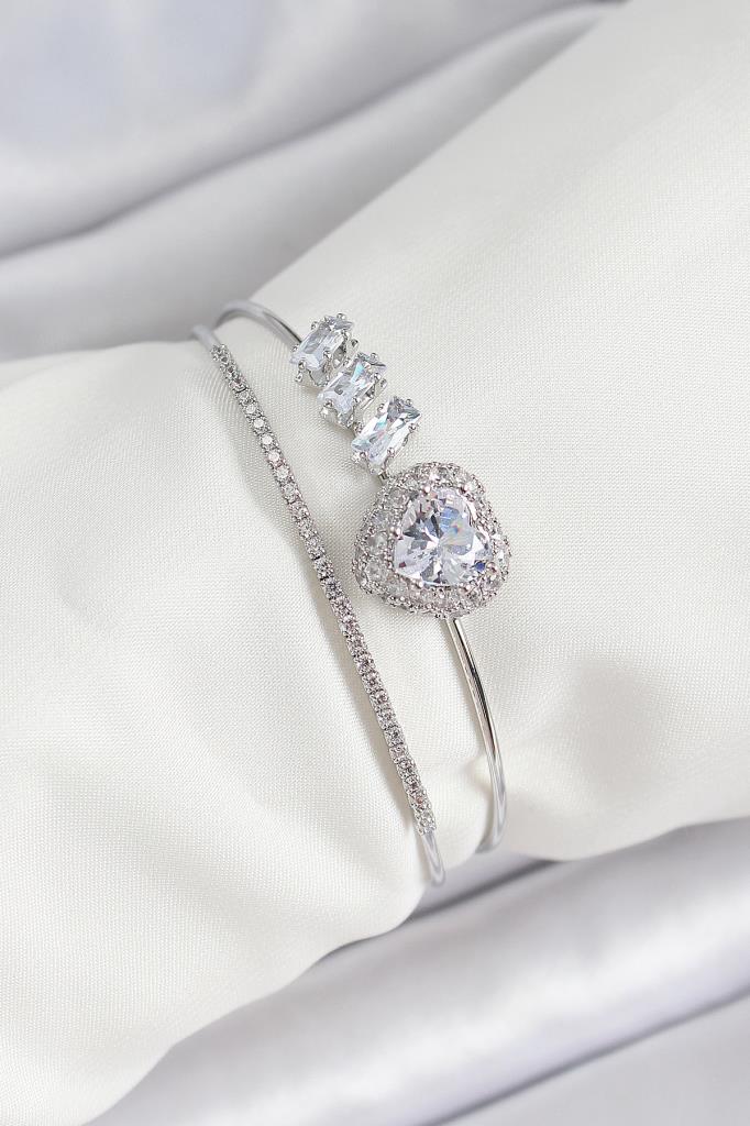 Pirinç Gümüş Renk Kalpli Zirkon Taşlı Kadın Bileklik - BB7065