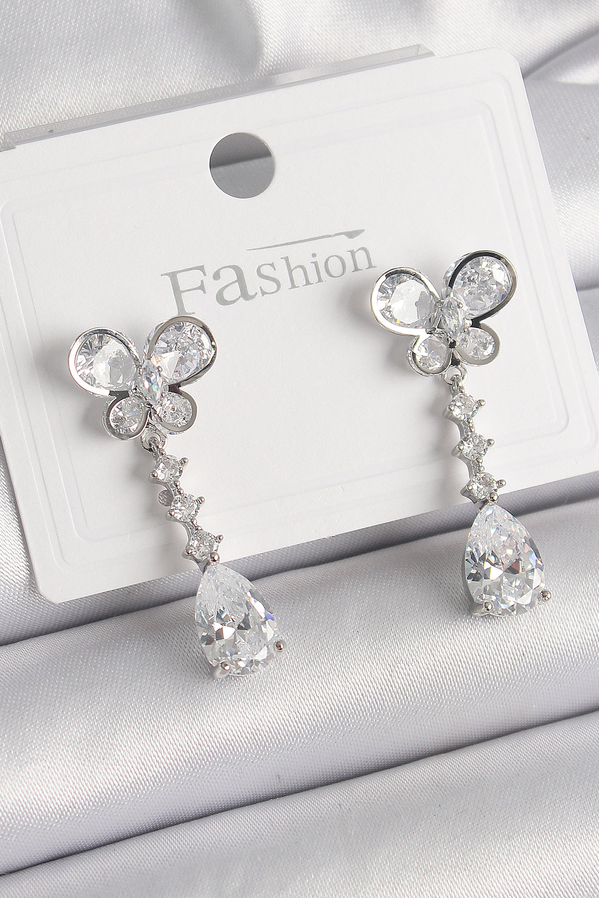 Pirinç Gümüş Renk Kelebek Model Sallantı Damla Zirkon Taşlı Kadın Küpe - TJ-BKP9861