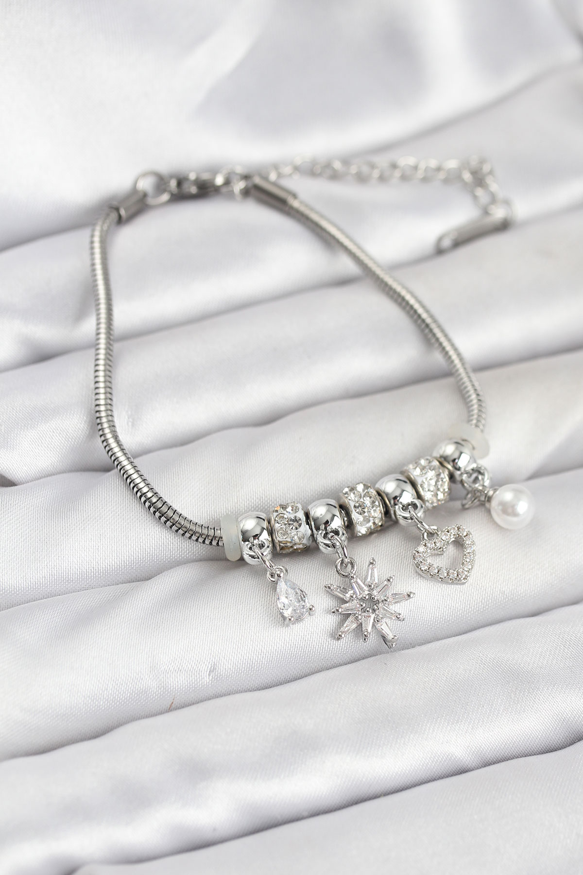 Pirinç Gümüş Renk Kutup Yıldızı ve Kalp Charmlı Kadın Bileklik - TJ-BB8180