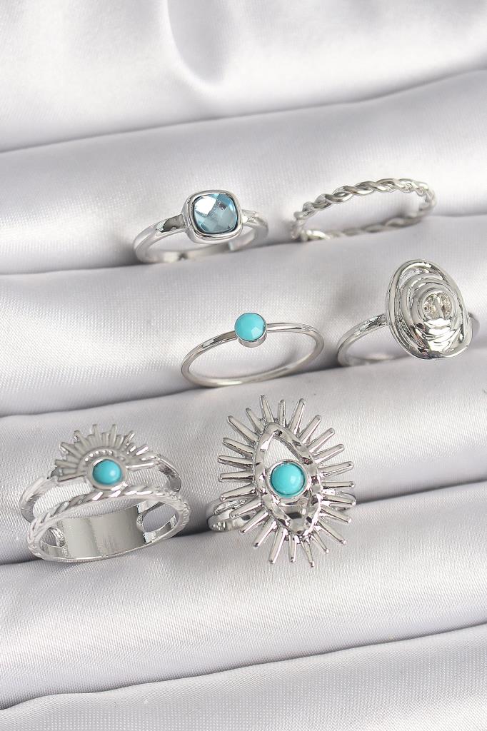 Pirinç Gümüş Renk Mavi Taşlı Kare Zirkon Taş Detaylı Kadın Yüzük Kombini - BYK3659